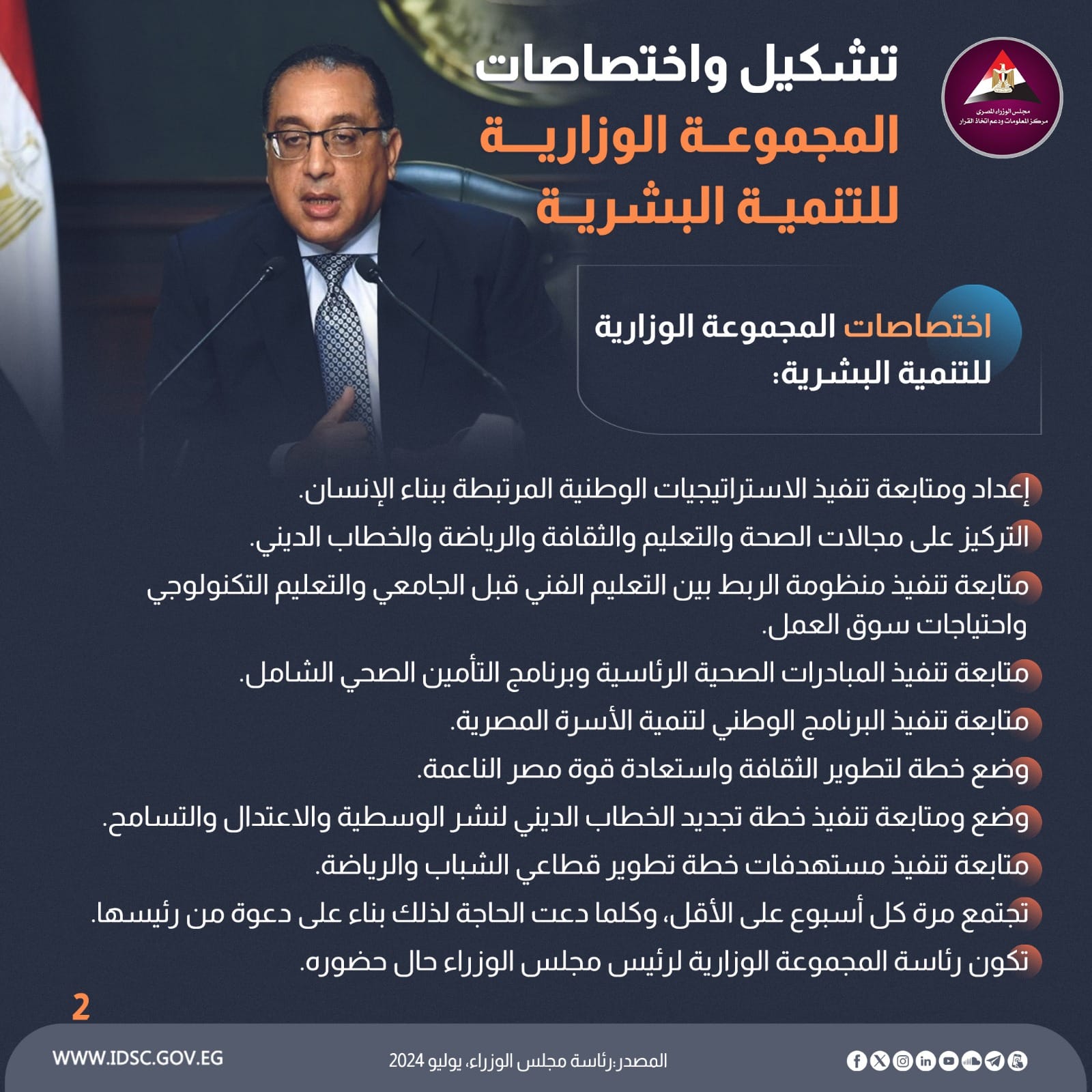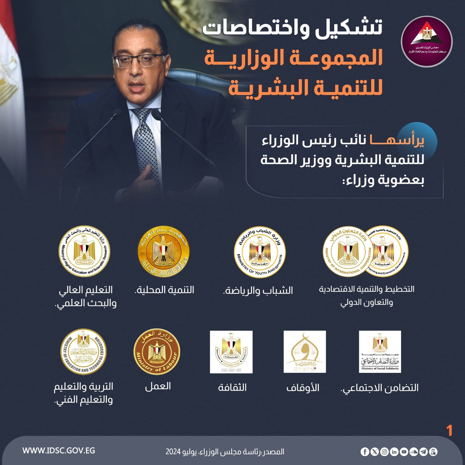 نص قرار تشكيل المجموعة الوزارية للتنمية البشرية، على أن تكون برئاسة السيد الدكتور نائب رئيس مجلس الوزراء للتنمية البشرية وزير الصحة والسكان، وعضوية كل من السادة وزراء: التخطيط والتنمية الاقتصادية والتعاون الدولي، والشباب والرياضة، والتعليم العالي والبحث العلمي، والتنمية المحلية، والتضامن الاجتماعي، والأوقاف، والعمل، والثقافة، والتربية والتعليم والتعليم الفني.