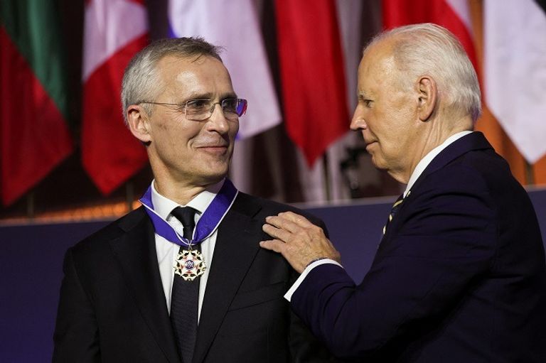 وعقب كلمته قلد الرئيس الأمريكي الأمين العام للناتو ينس ستولتنبرج "وسام الحرية" تقديرا لخدماته في قيادة الحلف، من دون أن يسقط في هنات اعتاد عليها خلال الشهور الماضية.