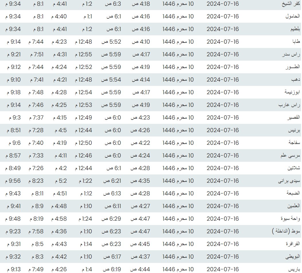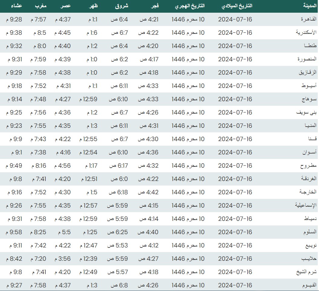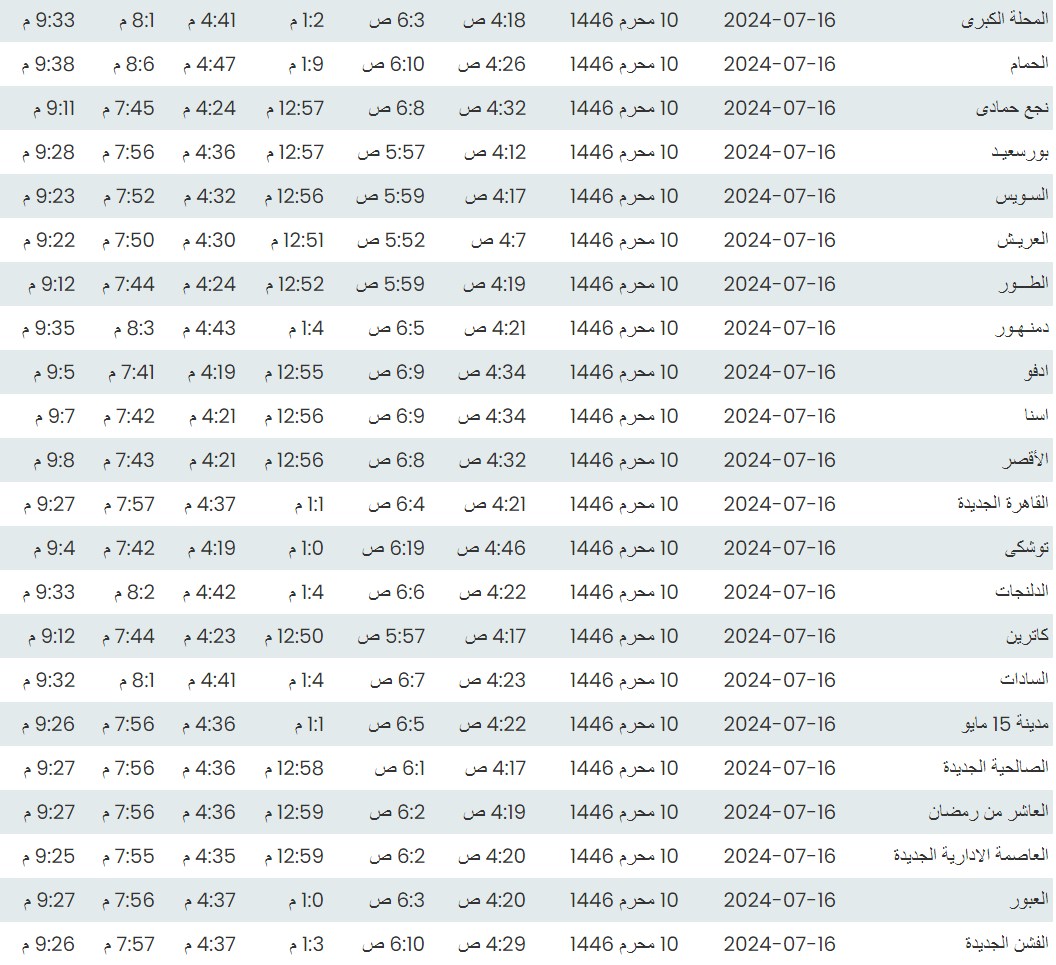 وفيما يلي مواقيت الصلاة، لعدد من مدن ومحافظات الجمهورية من واقع بيانات الهيئة العامة للمساحة