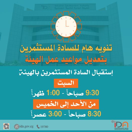 قررت الهيئة العامة للتنمية الصناعية، تعديل المواعيد الرسمية بالهيئة لزيادة ساعات العمل، وذلك تيسيرًا على المستثمرين والمصنعين لتوفير مساحة زمنية أكبر لتقديم خدمات الهيئة والإسراع في إنهاء الإجراءات، ويأتى هذا بناءًا على توجيهات الفريق مهندس كامل الوزير، نائب رئيس مجلس الوزراء للتنمية الصناعية وزير الصناعة والنقل والدكتورة ناهد يوسف رئيس الهيئة العامة للتنمية الصناعية.