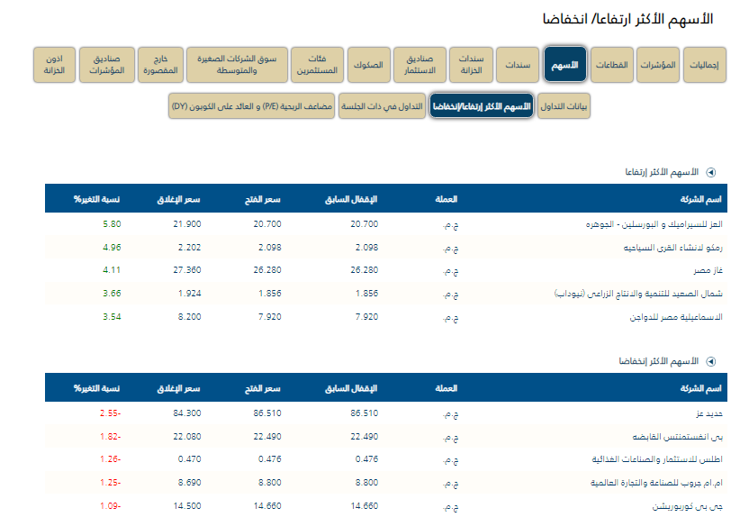 البورصة المصرية، الأسهم الأكثر ارتفاعا وانخفاضا خلال حركة التداولات