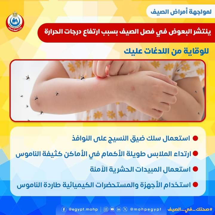 وجهت وزارة الصحة نصائح للحماية من للدغات البعوض في فصل الصيف حيث يعتبر موسم الصيف وارتفاع درجات الحرارة موسما لانتشار البعوض.