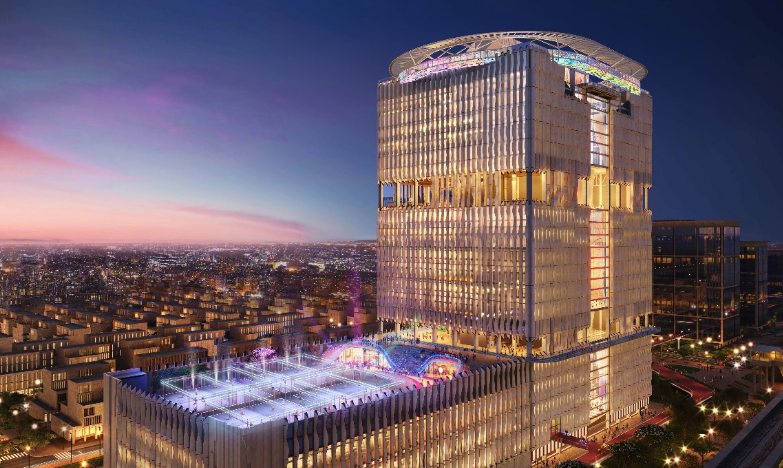 وأظهرت صورة لتصميم البرج، تفاصيل الشكل الخارجي، بينما سيضم في داخله مجموعة من الملاعب والصالات التي تتيح ممارسة مختلف أنواع الرياضات داخل البرج.