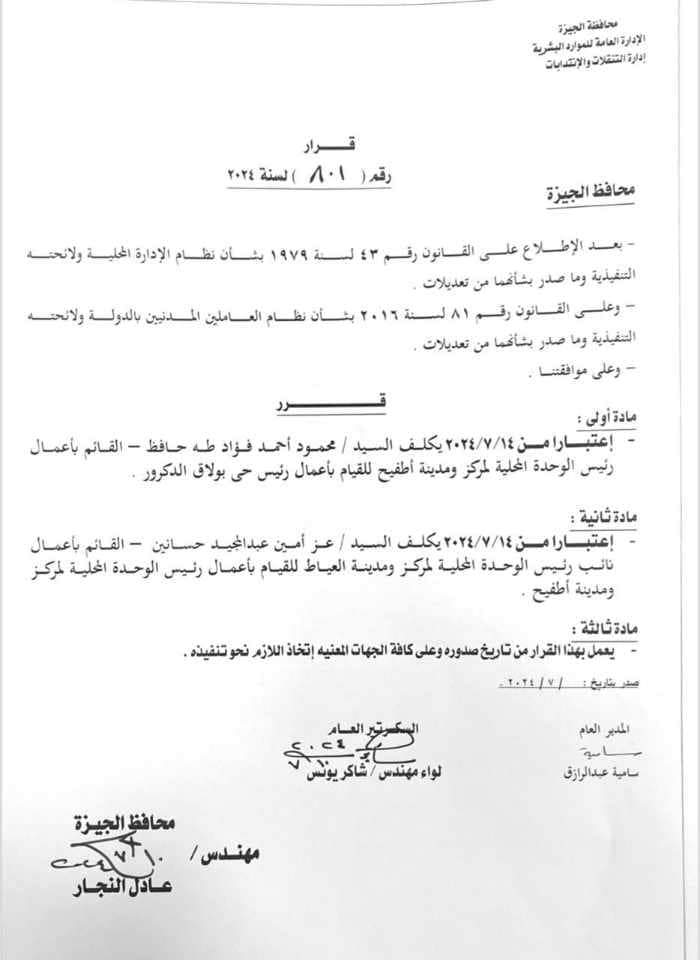 وأصدر محافظ الجيزة قرارا بتعيين محمود أحمد فؤاد طه حافظ القائم بأعمال رئيس الوحدة المحلية لمركز ومدينة أطفيح، ليكون مكلفًا بأعمال رئيس حي بولاق الدكرور اعتبارًا من 2024/07/14.