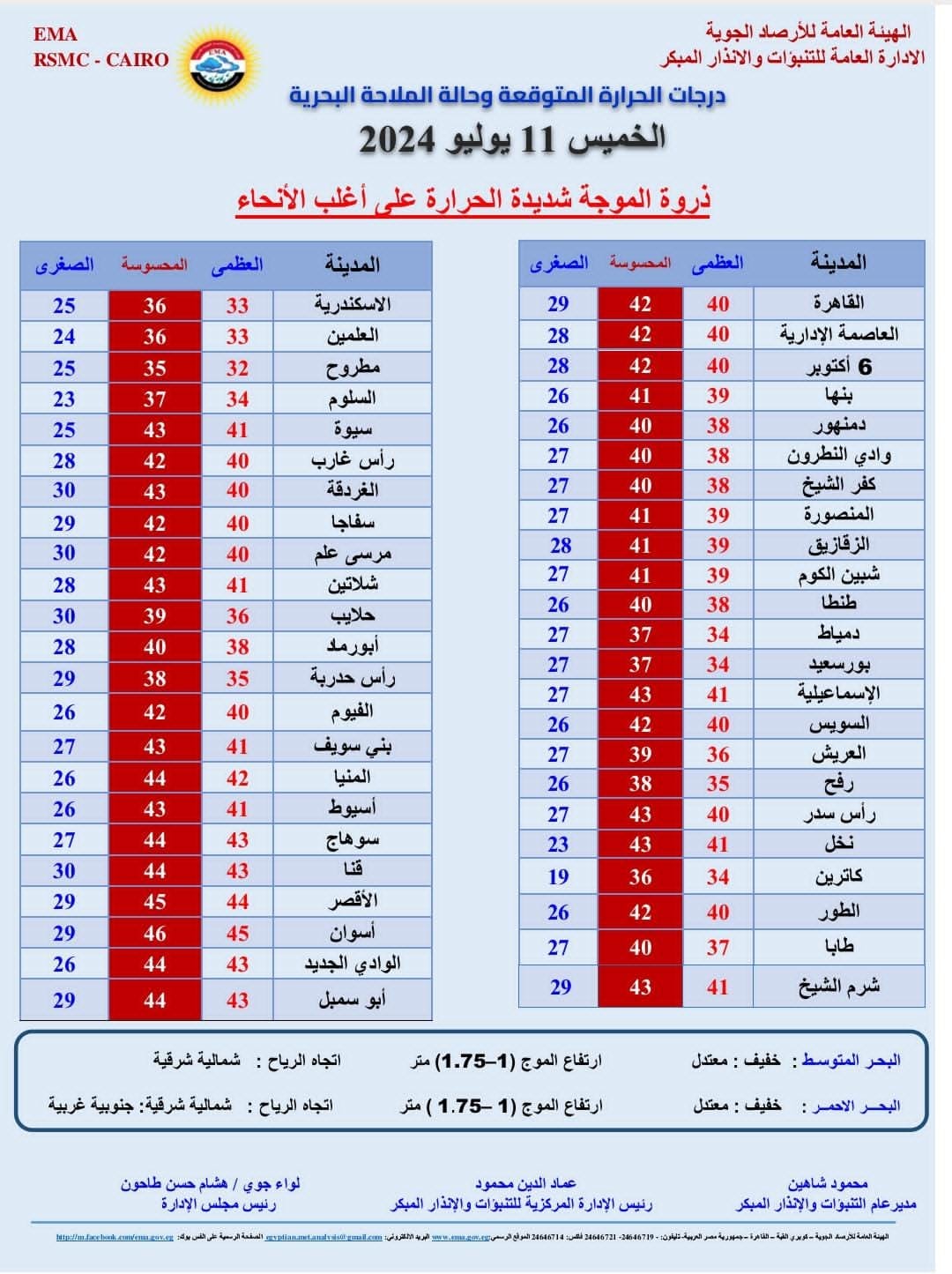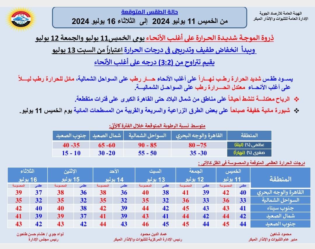 وتوقعت أن يسود طقس شديد الحرارة رطب نهارًا على القاهرة الكبرى الوجه البحري وشمال الصعيد وحار رطب على السواحل الشمالية وشديد الحرارة على جنوب سيناء وجنوب الصعيد.