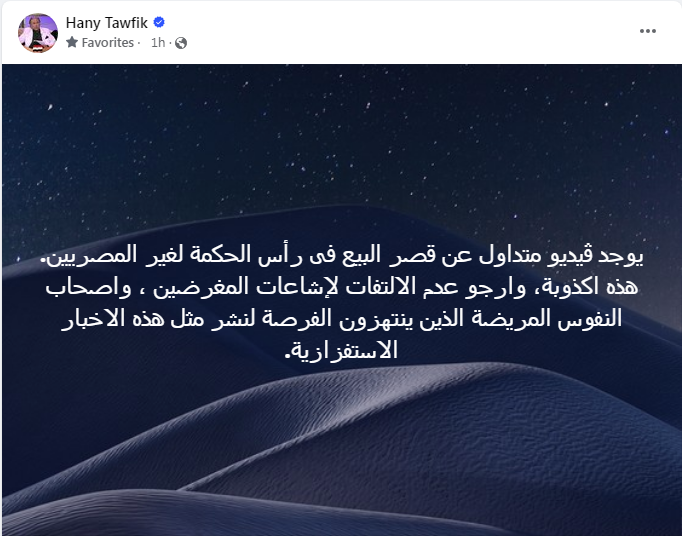 وكشف هاني توفيق حقيقة بيع الوحدات برأس الحكمة لغير المصريين فقال: "يوجد ڤيديو متداول عن قصر البيع فى رأس الحكمة لغير المصريين. هذه اكذوبة".