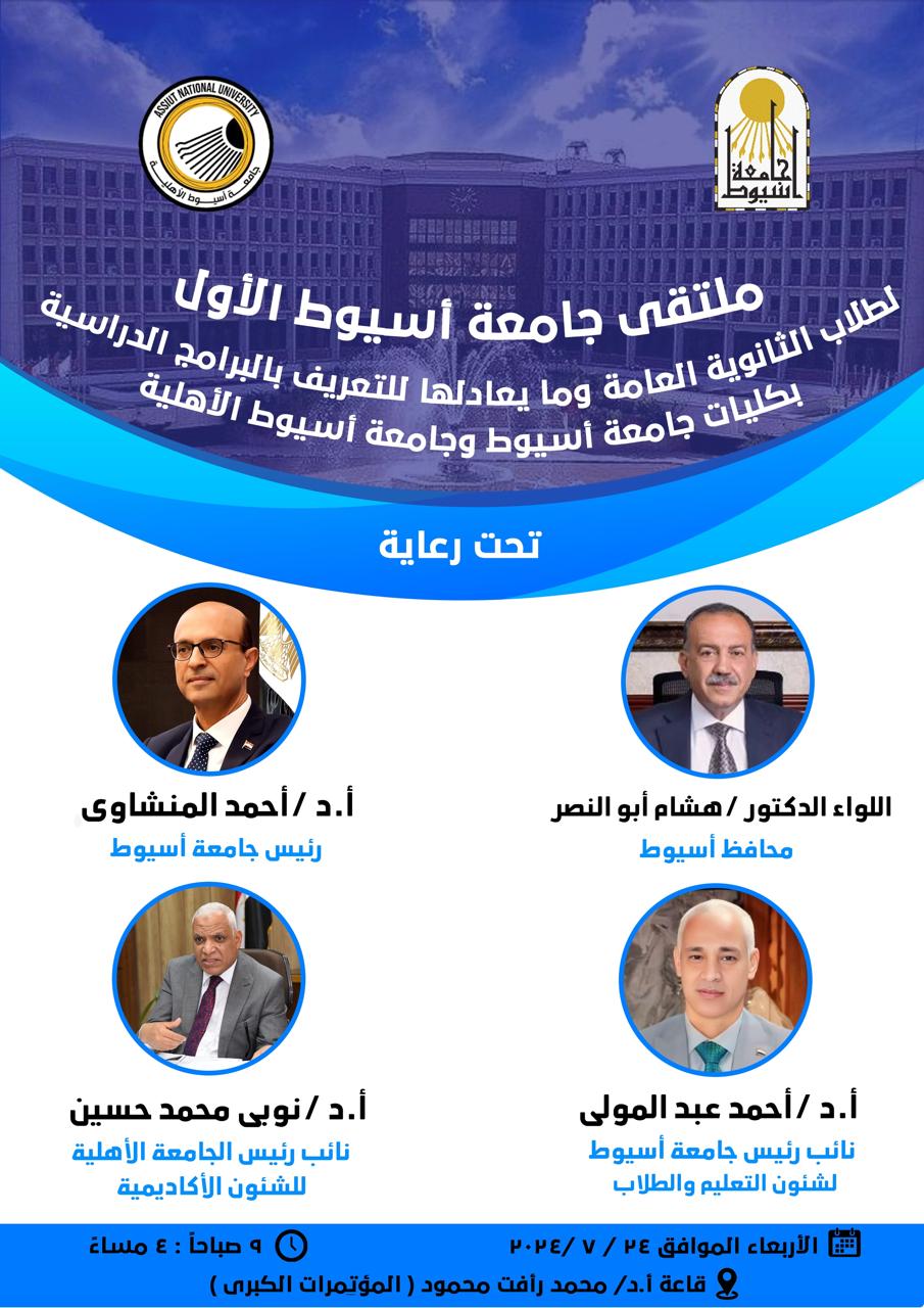 جاء ذلك بحضور اللواء دكتور هشام أبو النصر محافظ أسيوط، يوم الأربعاء الموافق ٢٤ من يوليو، في تمام الساعة التاسعة صباحًا؛ وذلك للتعريف بالبرامج الدراسية، بكليات جامعة أسيوط، وجامعة أسيوط الأهلية، تحت إشراف الدكتور أحمد عبد المولى نائب رئيس الجامعة لشئون التعليم والطلاب، والدكتور نوبي محمد حسن نائب رئيس الجامعة الأهلية للشئون الأكاديمية، والدكتور محمد جابر قاسم وكيل كلية التربية لشئون التعليم والطلاب، ومنسق الملتقى.