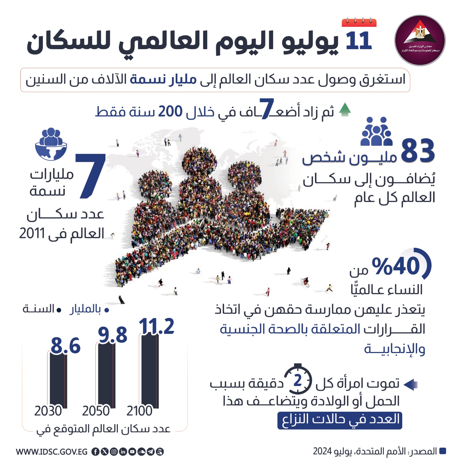 سلط مركز المعلومات ودعم اتخاذ القرار بمجلس الوزراء الضوء على الاحصائيات الخاصة بسكان العالم وذلك بالتزامن مع اليوم العالمي للسكان.