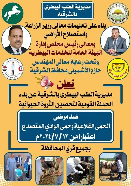 وبدوره أوضح اللواء دكتور إبراهيم محمد متولي وكيل الوزارة مدير مديرية الطب البيطري إكتمال استعدادات المديرية لإنطلاق الحملة القومية الثانية للتحصين ضد مرض الحمى القلاعية وحمى الوادي المتصدع لعام ٢٠٢٤م والتي من المقرر أن انطلاقها السبت القادم بالتنسيق مع الجهات التنفيذية والجمعيات الأهلية بالمحافظة من خلال (١٨٠) لجنة طبية وقائية (لجان ثابتة ومتحركة) مجهزة بكل التجهيزات والأدوات واللقاحات اللازمة ولجان والترقيم والتسجيل ولجان الإرشاد لتوعية المواطنين بأهمية التحصين مع لجان متابعة من الإدارات المختصة من المديرية ومديري الإدارات (١٧ لجنة) للمتابعة وتذليل العقبات لإنجاح فعاليات الحملة