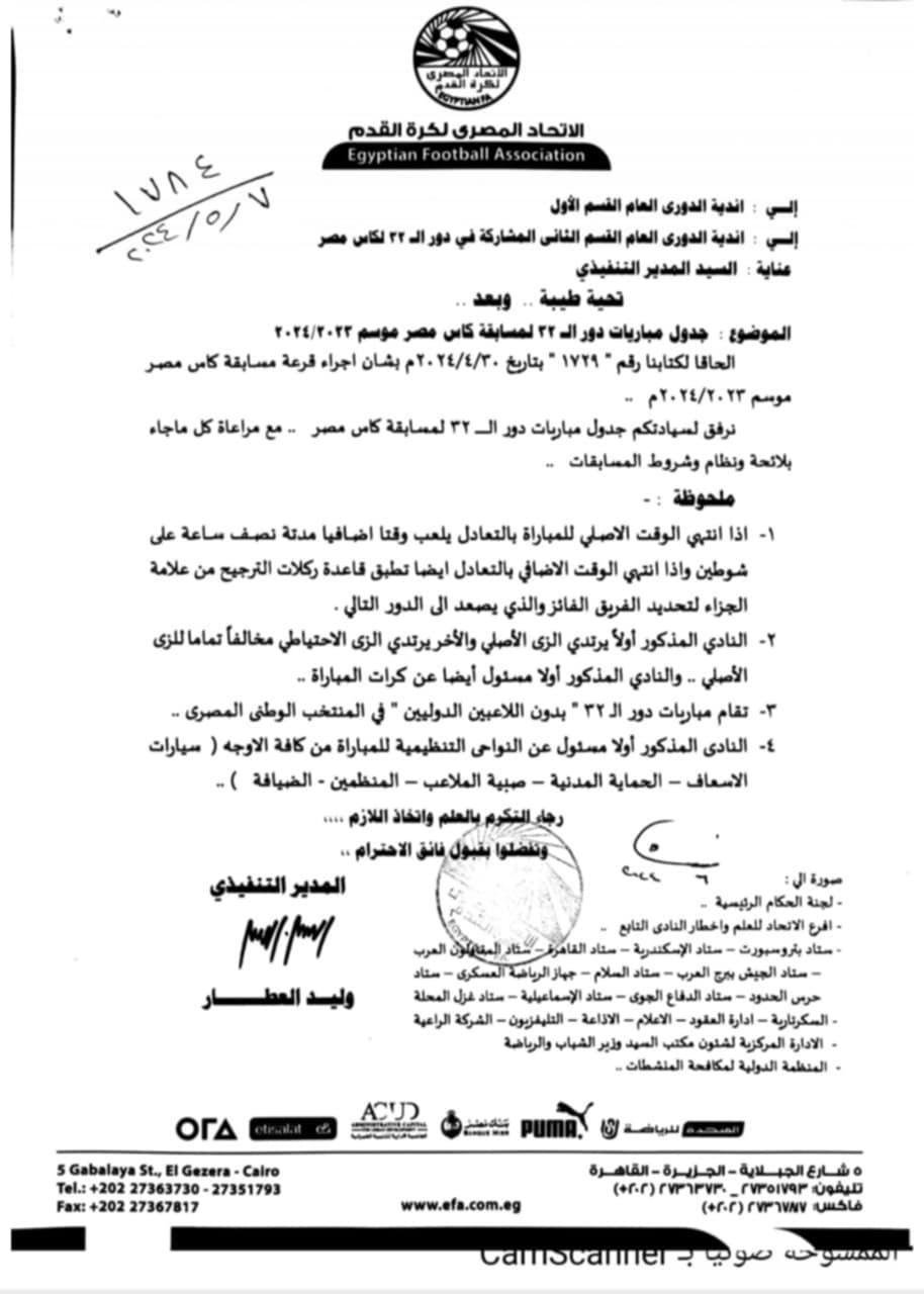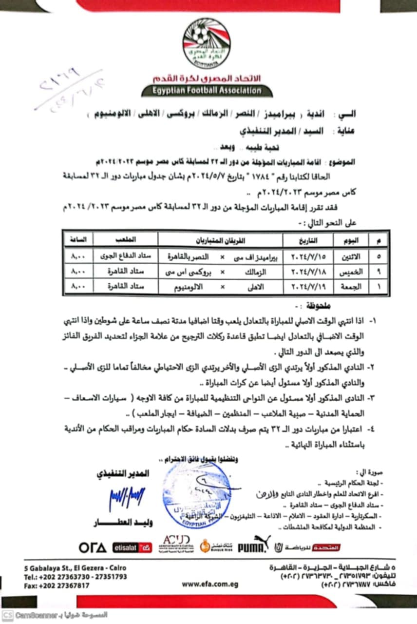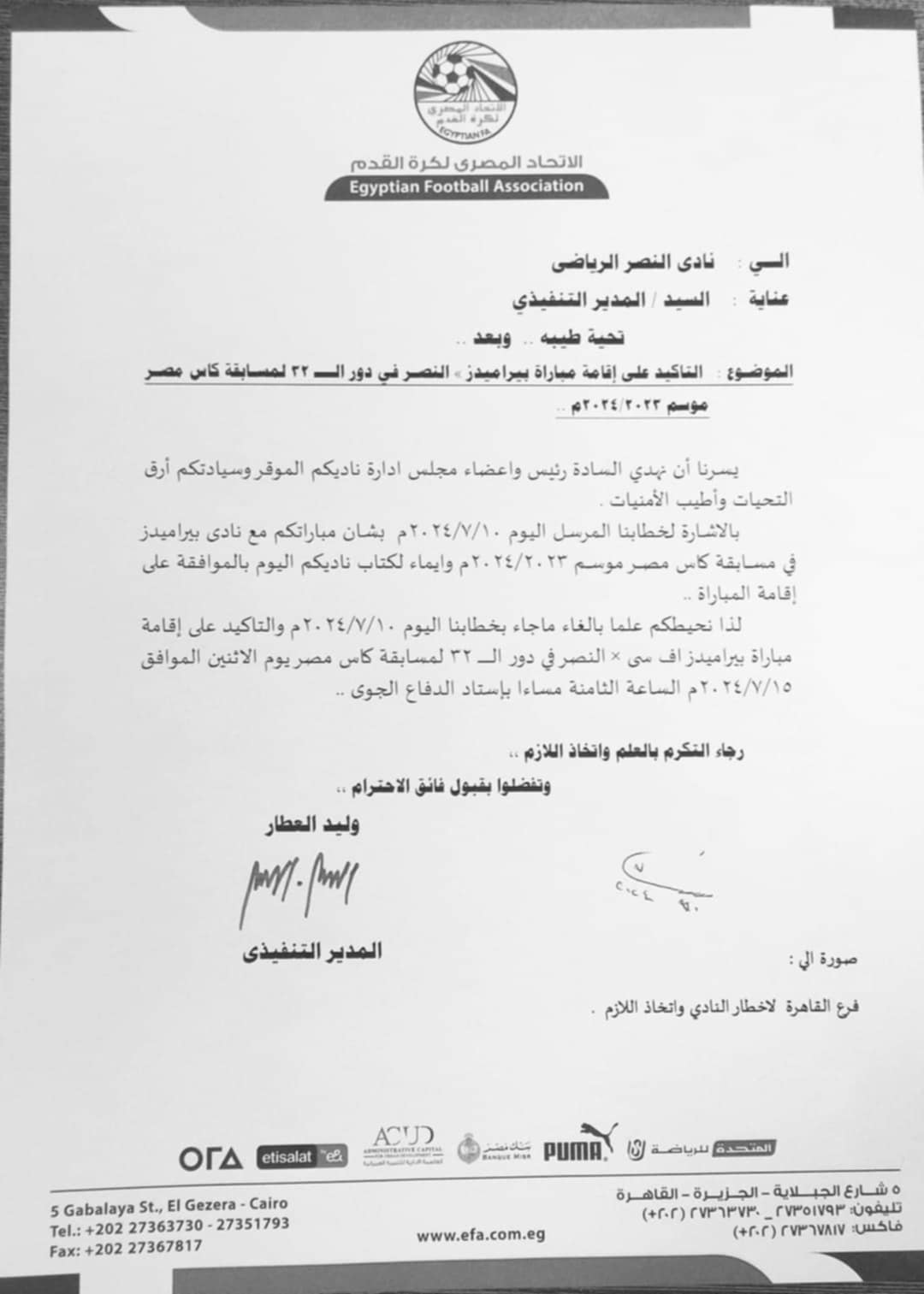 وتابع البيان: تلقي نادي النصر خطاب يفيد بأن موعد مباراة النصر امام بيراميدز في كأس مصر تم تحديده يوم 31 / 5 / 2024.. وفى يوم 27 / 5 تلقي نادي النصر خطاب من اتحاد الكرة يفيد بأنه تم تأجيل المباراة لموعد سيتم تحديدة لاحقًا بدلًا من اقامتها من 31 / 5 ثم تم ابلاغنا بأقامه المباره في الفتره مابين 12 يونيو الى 15 يونيو.