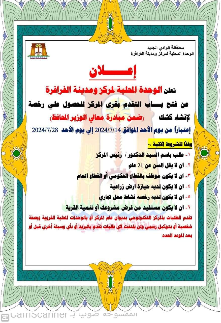 أعلنت الوحدة المحلية لمركز ومدينة الفرافرة بمحافظة الوادي الجديد، في بيان لها اليوم الخميس، عن فتح باب التقدم بقرى المركز، للحصول علي رخصة نشاط تجاري “إنشاء كشك” ضمن مبادرة اللواء محمد الزملوط محافظ الوادي الجديد، اعتبارًا من يوم الأحد الموافق 2024/7/14 إلي يوم الأحد 2024/7/28.