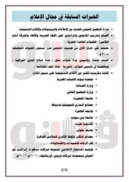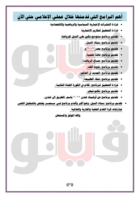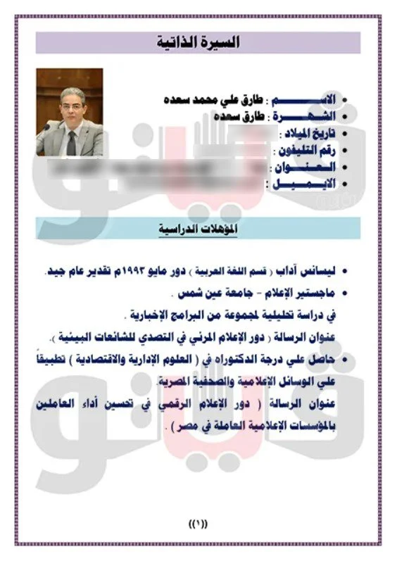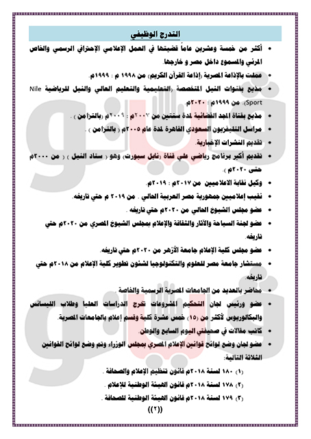 وأوضح في سيرته الذاتية تدرجه الوظيفي خلال 25 عامًا عمل بالمجال الإعلامي، كما تطرق أيضًا إلى الشهادات والدورات التي حصل عليها والخبرات السابقة في المجال الإعلامي.