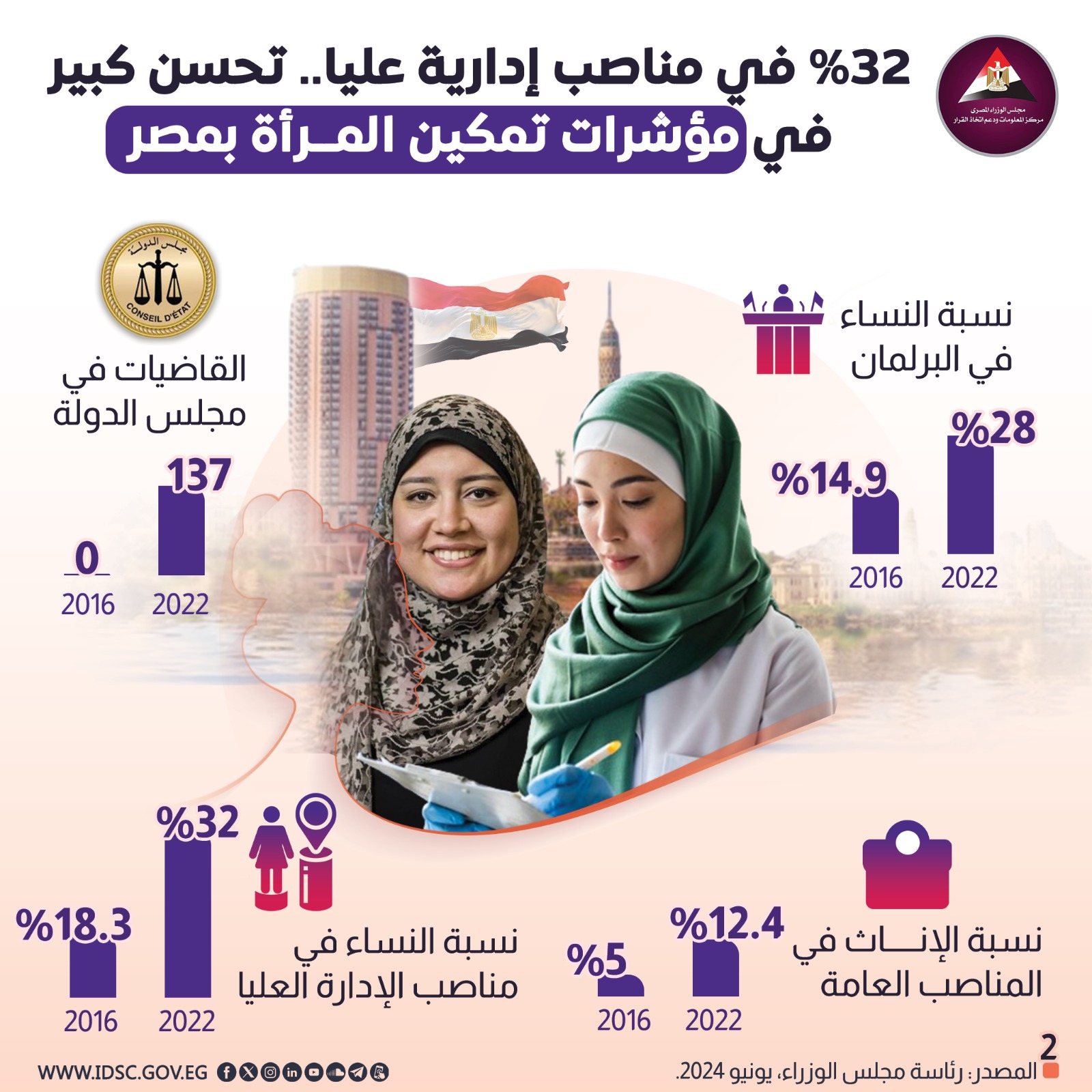 32 % في مناصب إدارية عليا، تحسن بمؤشرات تمكين المرأة المصرية