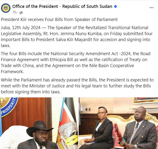 وفقا لما نشرتها صفحة رئاسة جمهورية جنوب السودان على موقع التواصل الاجتماعى "فيسبوك"، تشمل مشاريع القوانين الأربعة “قانون الأمن القومي المعدل لعام 2024، ومشروع قانون اتفاقية تمويل الطرق مع إثيوبيا، ومعاهدة التجارة مع الصين، اتفاقية الإطار التعاوني لحوض النيل.