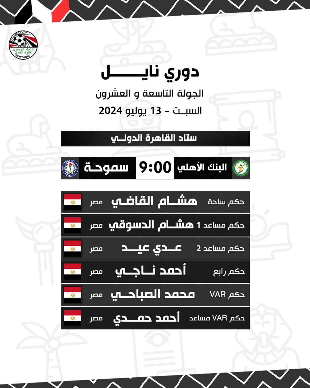 الدوري المصري، أعلنت لجنة الحكام الرئيسية باتحاد الكرة، أسماء حكام مباراة اليوم السبت التي ستجمع فريقي البنك الأهلي ضد سموحة، ضمن مواجهات الدوري المصري الممتاز، وجاءت على النحو التالي:
