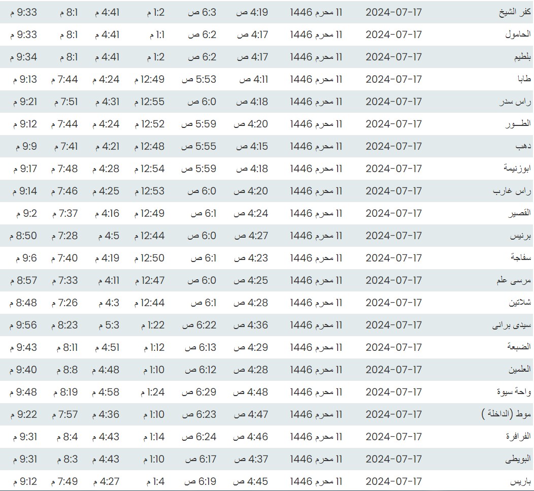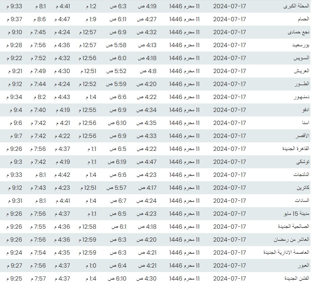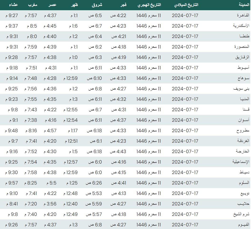 مواقيت الصلاة اليوم وفقًا للتوقيت المحلي لمدينتي القاهرة والإسكندرية وكذلك،مواقيت الصلاة، لعدد من مدن ومحافظات الجمهورية من واقع بيانات الهيئة العامة للمساحة
