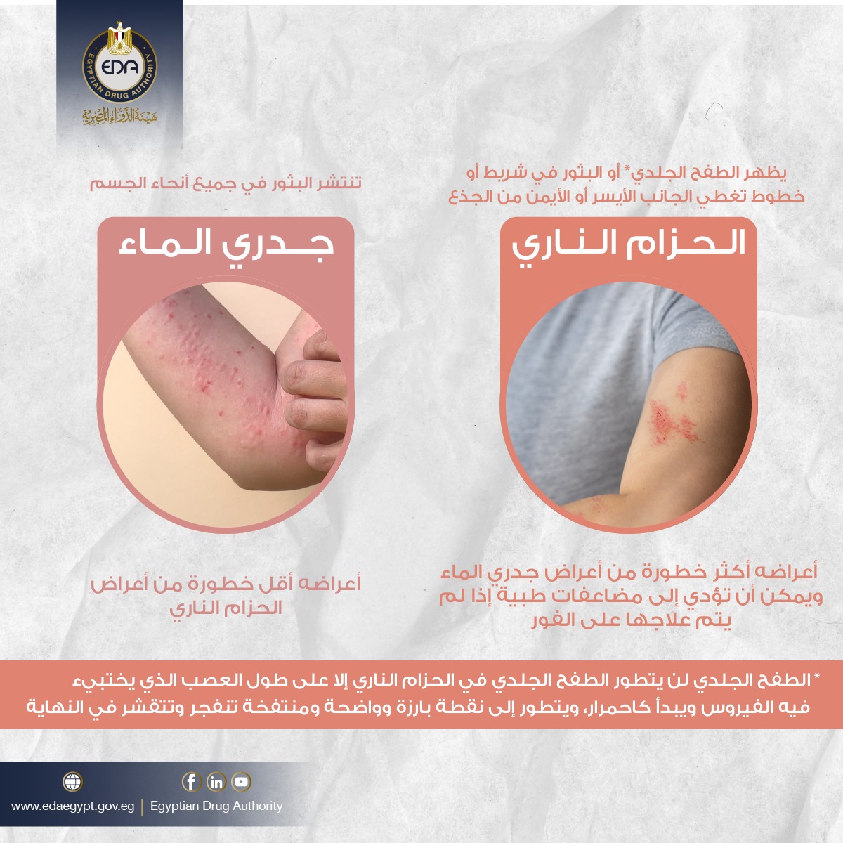 وأكدت هيئة الدواء المصرية أنه بمجرد الإصابة بالعدوى، سيصاب الشخص بجدري الماء وليس بالحزام الناري.