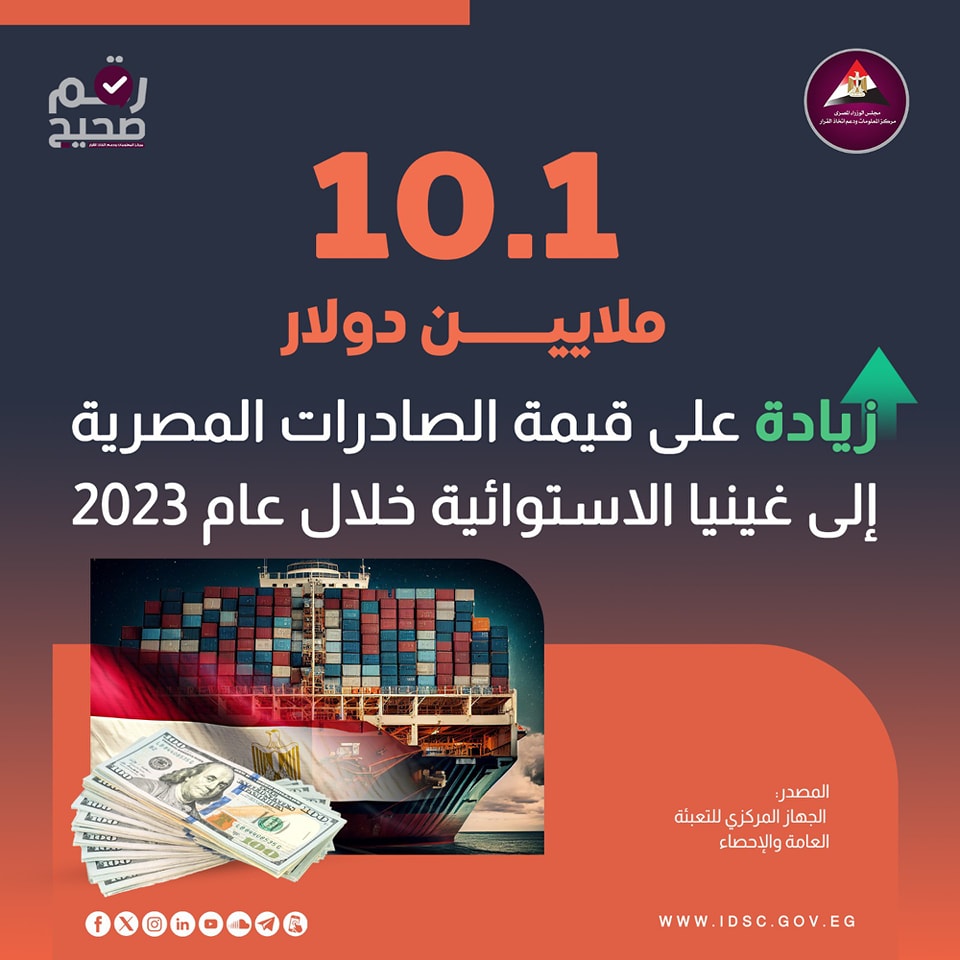 سجلت بيانات الجهاز المركزي للتعبئة العامة والإحصاء 10.1 مليون دولار زيادة في قيمة الصادرات المصرية إلى غينيا الاستوائية خلال عام 2023.
