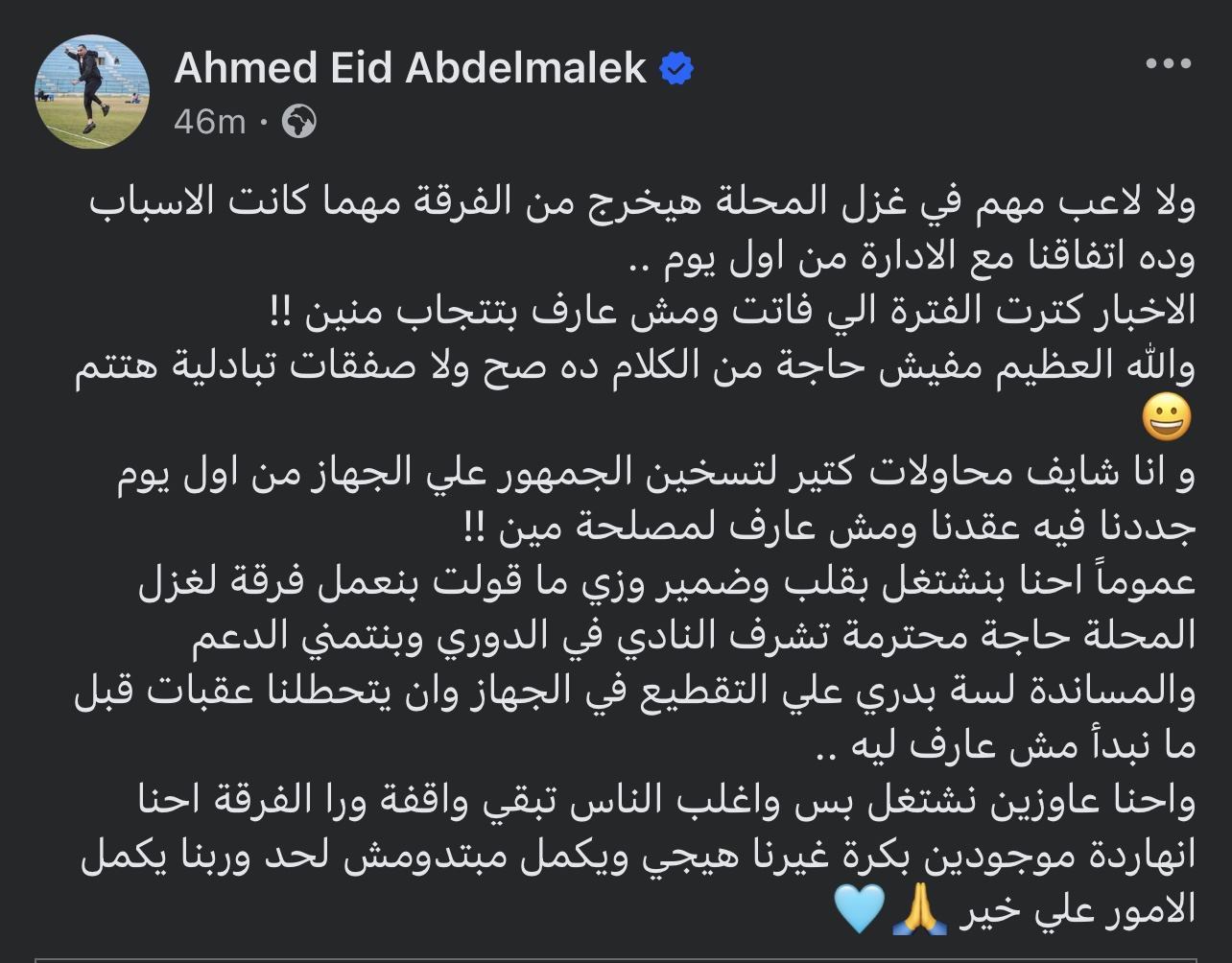وقال عبد الملك عبر صفحته علي موقع التواصل الاجتماعي فيسبوك "لا يوجد لاعب سيرحل عن صفوف غزل المحلة مهما كانت الأسباب وهذا ما تم الاتفاق عليه مع إدارة النادي".