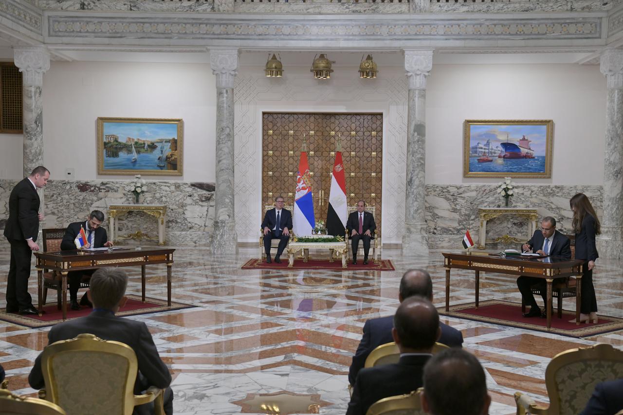 إن المباحثات التي أجريتها اليوم مع فخامة الرئيس.. تؤكد تطلعنا المشترك لاستمرار البناء على الزخم.. الذي تشهده العلاقات الثنائية في أعقاب زيارتي إلى بلدكم الصديق في عام 2022.. حيث عكست الحفاوة التي حظيت بها من فخامتكم.. والطفرة التي شهدتها وتيرة التعاون، في مختلف المجالات: السياسية والاقتصادية والعسكرية والثقافية في أعقابها.. وجود إيمان مشترك.. بأهمية وضع أساس راسخ.. لتنمية العلاقات الشاملة، بين مصر وصربيا.