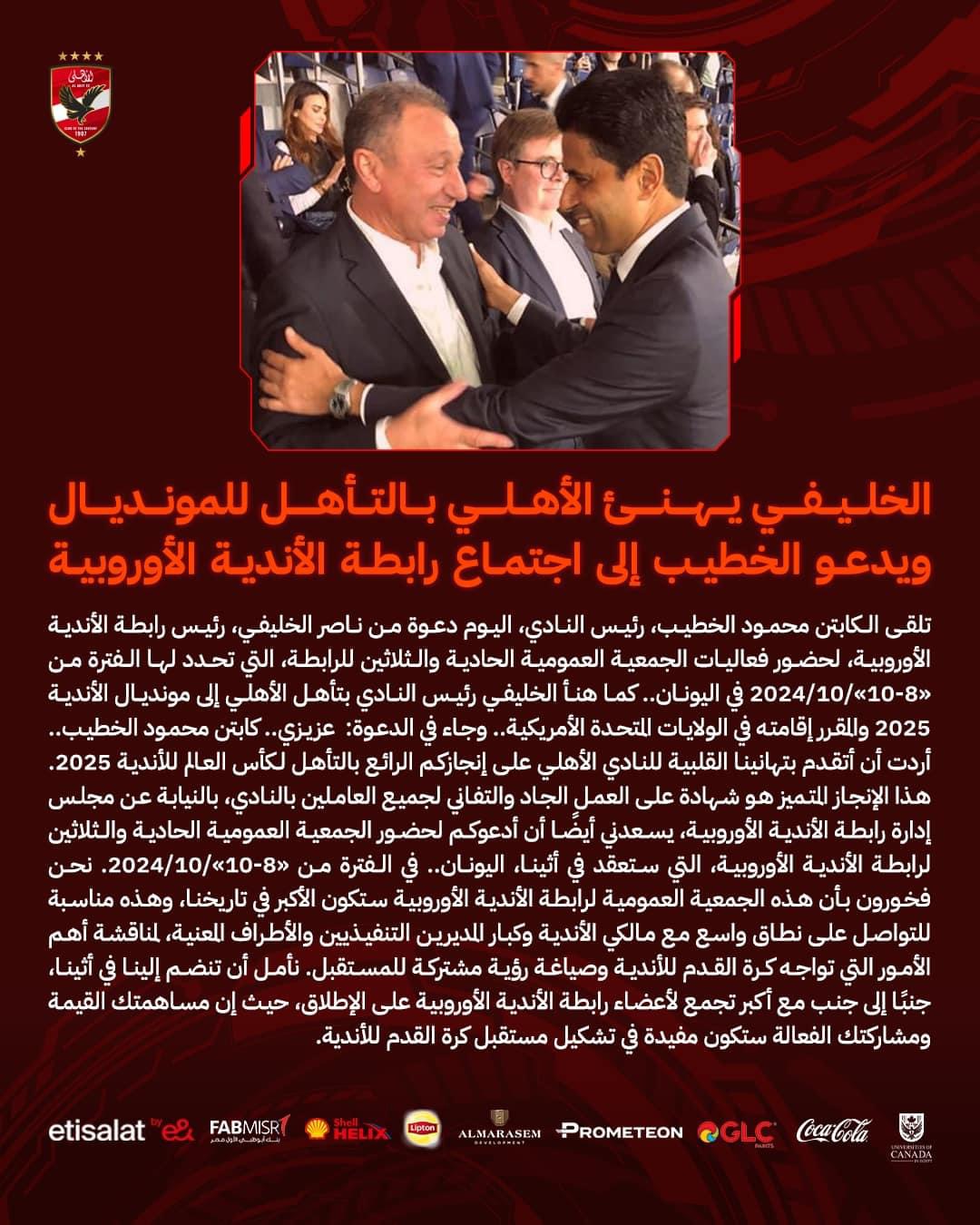 تلقى محمود الخطيب رئيس النادي الأهلي اليوم السبت، دعوة من ناصر الخليفي رئيس رابطة الأندية الأوروبية لحضور فعاليات الجمعية العمومية الحادية والثلاثين للرابطة، والتي تحدد لها الفترة من “8-10” أكتوبر في اليونان.