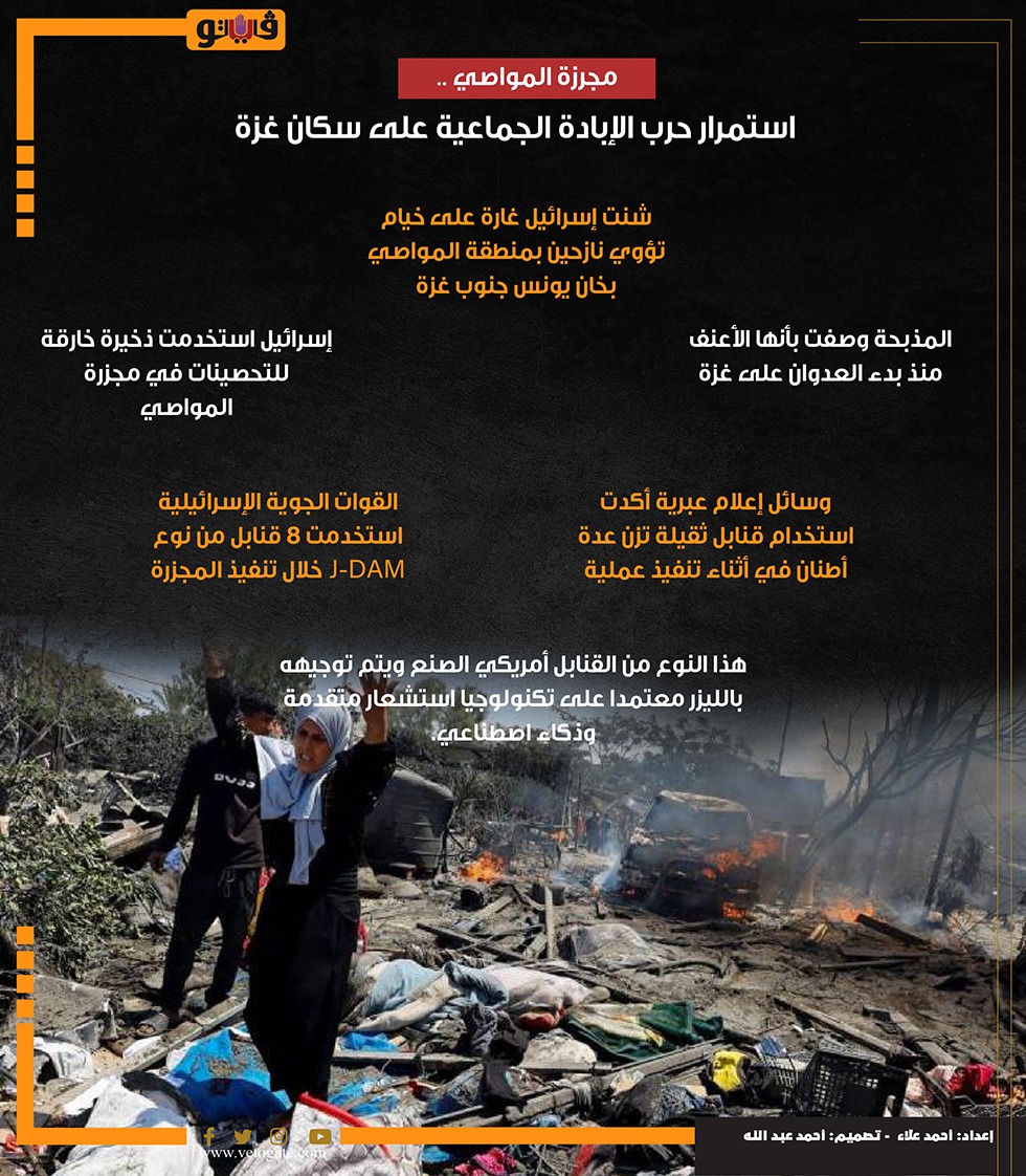 مجرزة المواصي.. استمرار حرب الإبادة الجماعية على سكان غزة (انفوجراف) الأحد 14/يوليو/2024 - 01:57 م 7/14/2024 1:57:35 PM المواصي، فيتو احمد علاء شارك طباعة 18 حجم الخط شارك طباعة مجرزة المواصي غزة جنوب غزة خان يونس إسرائيل