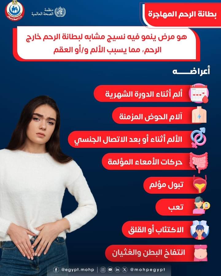 وكشفت وزارة الصحة أن بطانة الرحم المهاجرة مرض ينمو فيه نسيج مشابه لبطانة الرحم خارج الرحم مما يسبب الألم أو العقم.