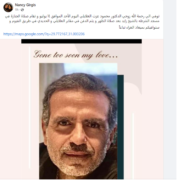 وكتبت زوجة الدكتور الراحل محمود عزت العلايلي على صفحتها الشخصية على موقع التواصل الاجتماعي “فيسبوك”: "توفي إلى رحمة الله زوجي الدكتور محمود عزت العلايلي اليوم الأحد الموافق 14 يوليو، وتقام صلاة الجنازة في مسجد الشرطة بالشيخ زايد، بعد صلاة الظهر، ويتم الدفن في مقابر العلايلي والحديدي في طريق الفيوم، وسنوافيكم بميعاد العزاء تباعًا".