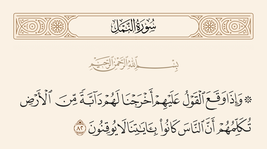 قال تعالى: «وَإِذَا وَقَعَ الْقَوْلُ عَلَيْهِمْ أَخْرَجْنَا لَهُمْ دَابَّةً مِنَ الْأَرْضِ تُكَلِّمُهُمْ أَنَّ النَّاسَ كَانُوا بِآيَاتِنَا لَا يُوقِنُونَ».