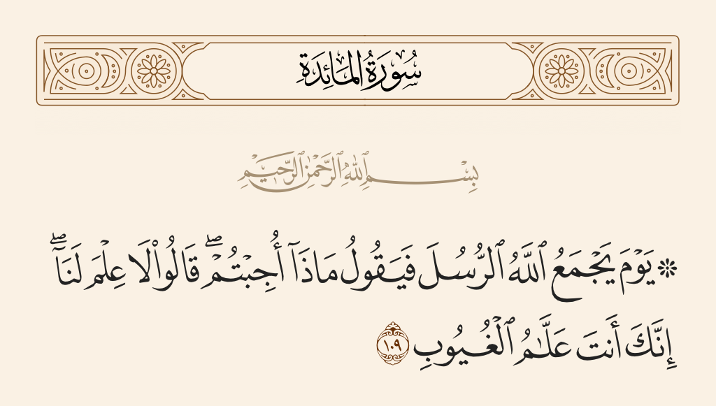 قال تعالى: «يَوْمَ يَجْمَعُ اللَّهُ الرُّسُلَ فَيَقُولُ ماذا أُجِبْتُمْ قالُوا لا عِلْمَ لَنا إِنَّكَ أَنْتَ عَلاَّمُ الْغُيُوبِ».