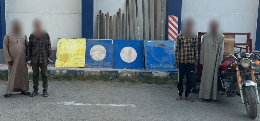 وفى مديرية أمن بنى سويف؛ ضبط 4 عناصر إجرامية - لهم معلومات جنائية؛ لقيامهم بسرقة اللوحات الإرشادية من الطرق العامة بدائرة مركز شرطة بنى سويف بمديرية أمن بنى سويف، وبحوزتهم (7 لوحات إرشادية - 19 "حامل لوحات إرشادية" – مركبة "تروسيكل").