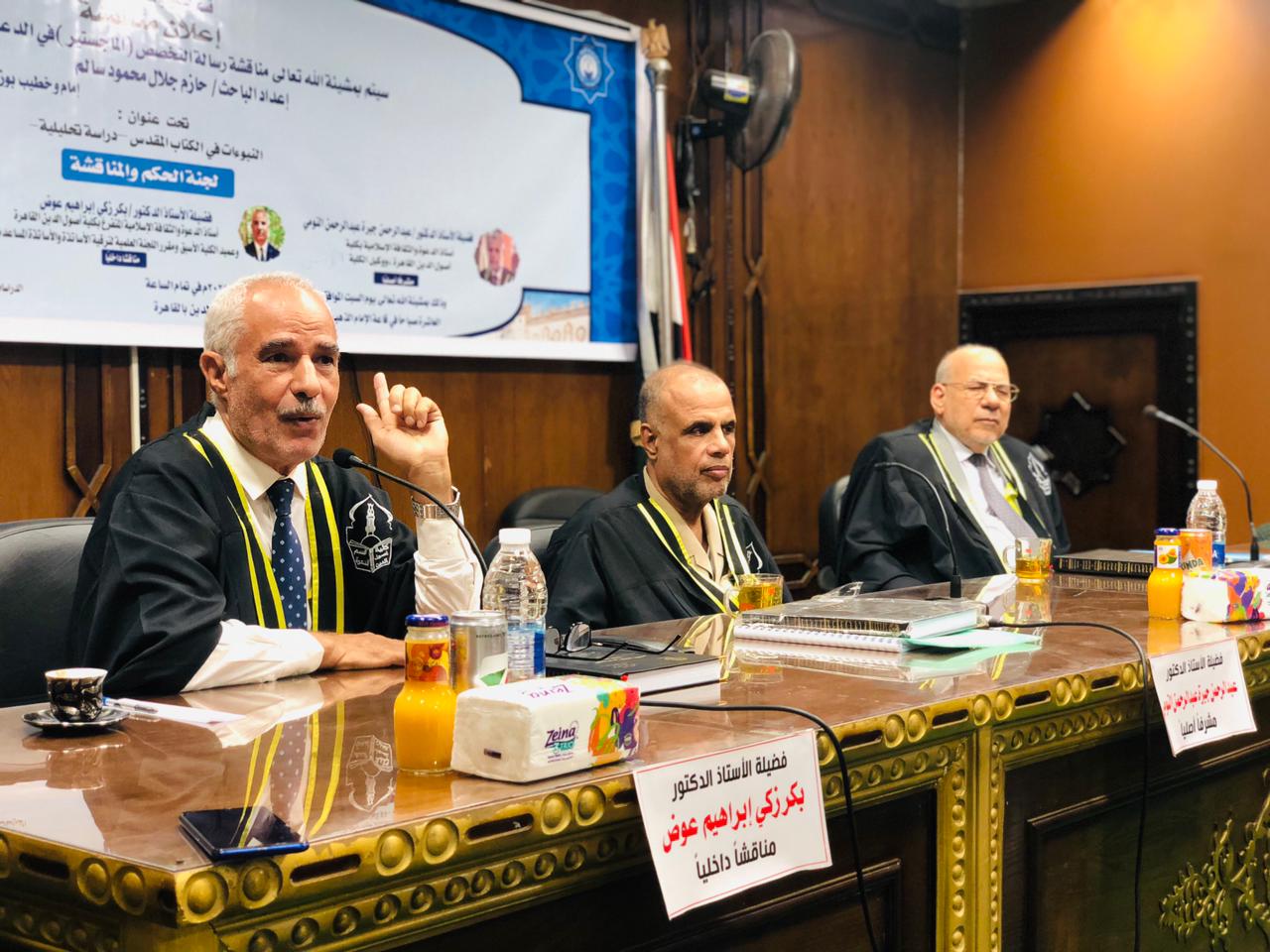 واستمرت المناقشة لمدة ثلاث ساعات، وخلت اللجنة بعد المناقشة للمداولة، وأقرت اللجنة بالإجماع منح الطالب حازم جلال محمود سالم درجة التخصص الماجستير فى الدعوة والثقافة الإسلامية، بتقدير "ممتاز".