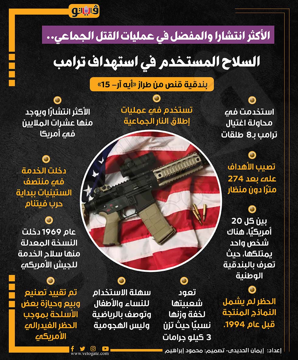 الأكثر انتشارا والمفضل في عمليات القتل الجماعي.. السلاح المستخدم في استهداف ترامب (إنفوجراف) الثلاثاء 16/يوليو/2024 - 09:53 م 7/16/2024 9:53:59 PM السلاح المستخدم في اغتيال ترامب، فيتو إيمان الحديدى شارك طباعة 18 حجم الخط شارك طباعة اغتيال ترامب الفيدرالى الامريكى حرب فيتنام محاولة اغتيال ترامب عمليات إطلاق النار الجماعية