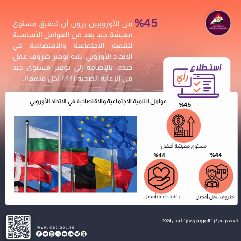 وأوضح الاستطلاع أن 45% من الأوروبيين أن تحقيق مستوى معيشة جيد يعد من العوامل الأساسية للتنمية الاجتماعية والاقتصادية في الاتحاد الأوروبي، يليه توفير ظروف عمل جيدة، بالإضافة إلى توفير مستوى جيد من الرعاية الصحية (44٪ لكل منهما).