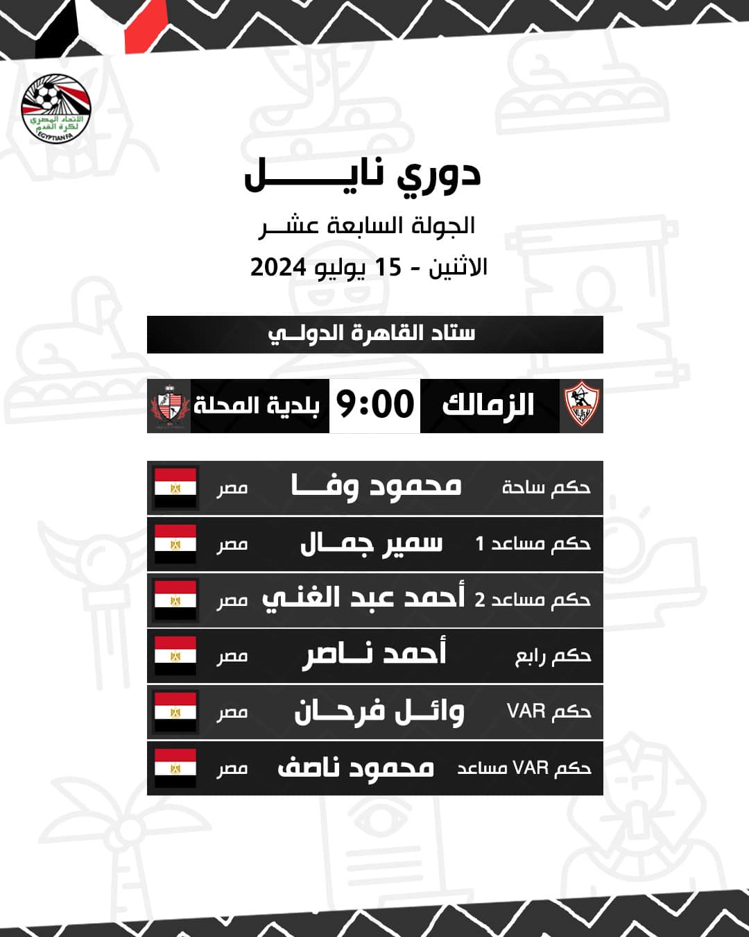 أعلنت لجنة الحكام الرئيسية باتحاد الكرة، أسماء حكام مباريات اليوم الإثنين، حيث يلتقي الزمالك مع بلدية المحلة في اللقاء المؤجل بينهما من الجولة السابعة عشر من الدوري المصري.