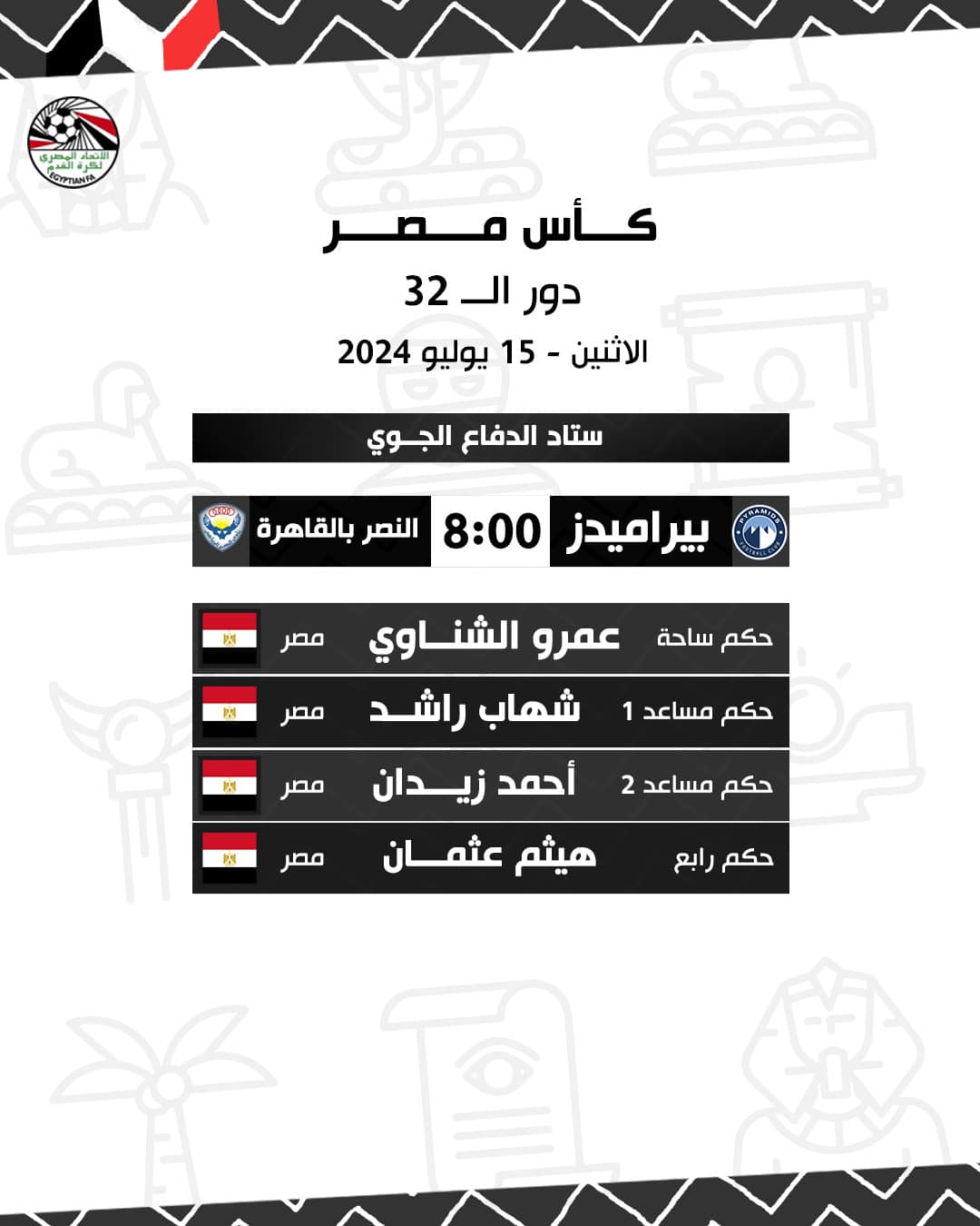على الجانب الآخر، يلتقي بيراميدز مع النصر القاهري ضمن مواجهات دور الـ32 من مسابقة كأس مصر.. وجاء حكام المباراتين على النحو التالي: