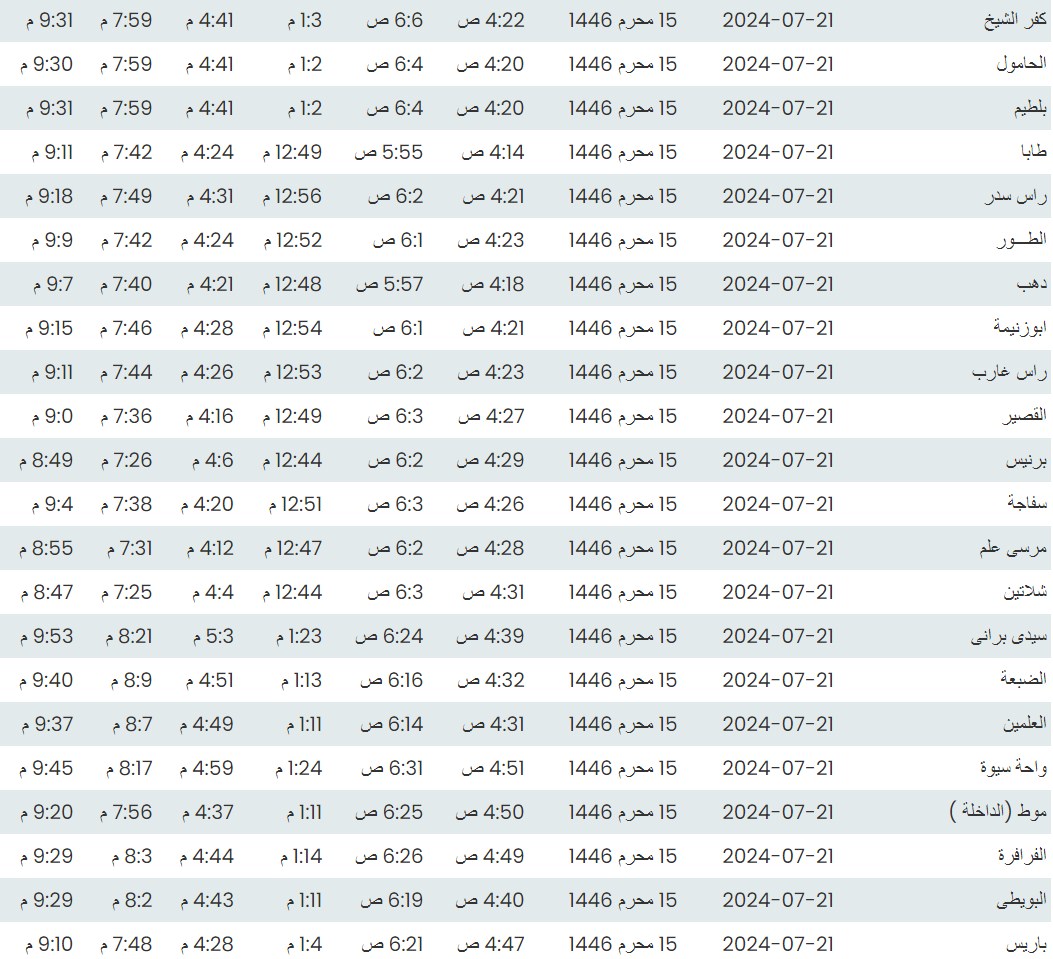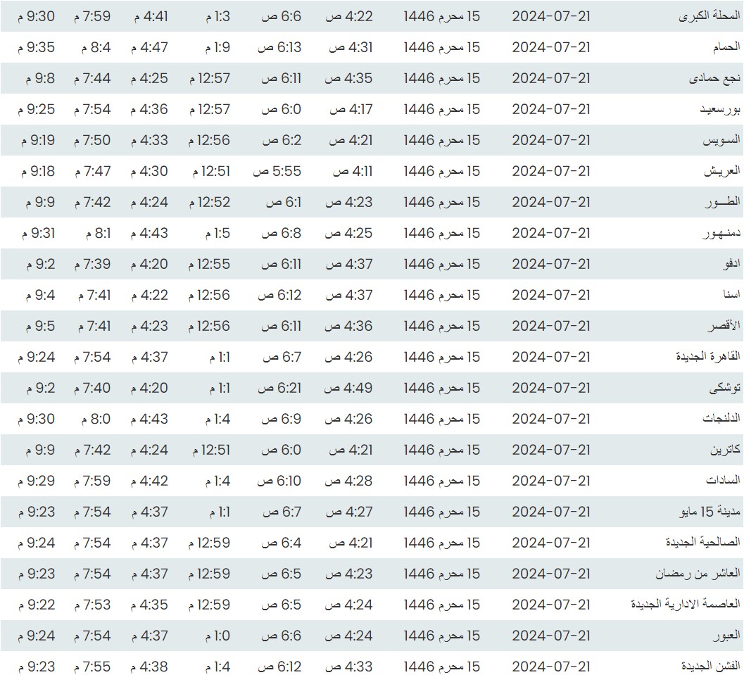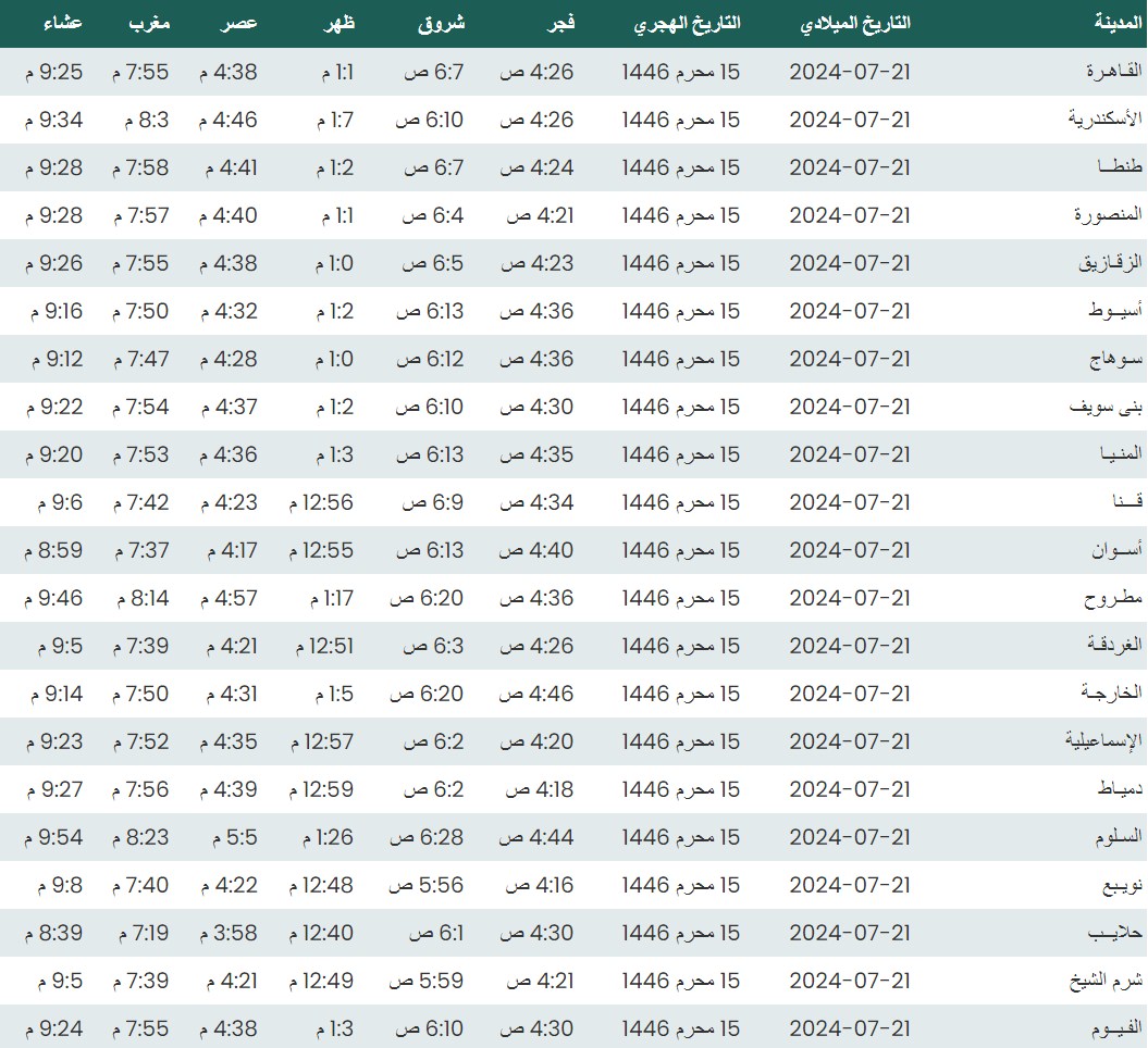 وفيما يلي مواقيت الصلاة، لعدد من مدن ومحافظات الجمهورية من واقع بيانات الهيئة العامة للمساحة
