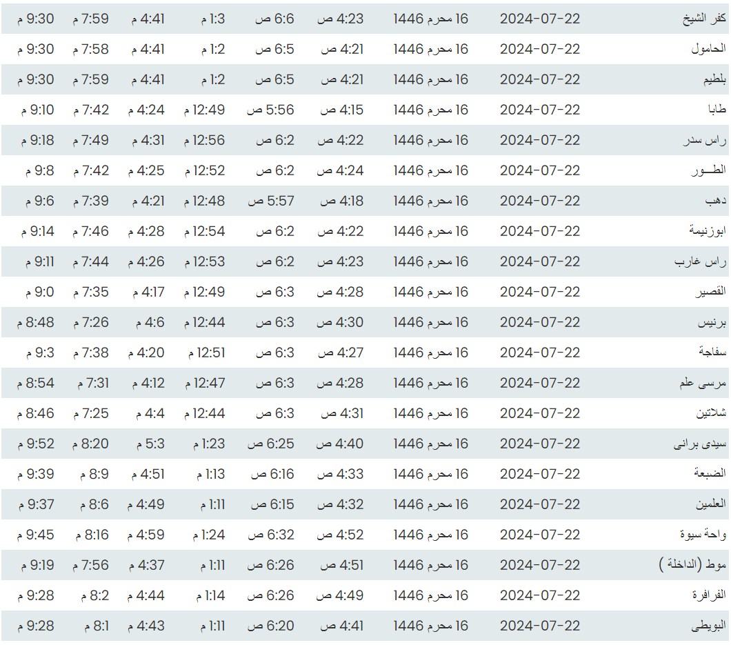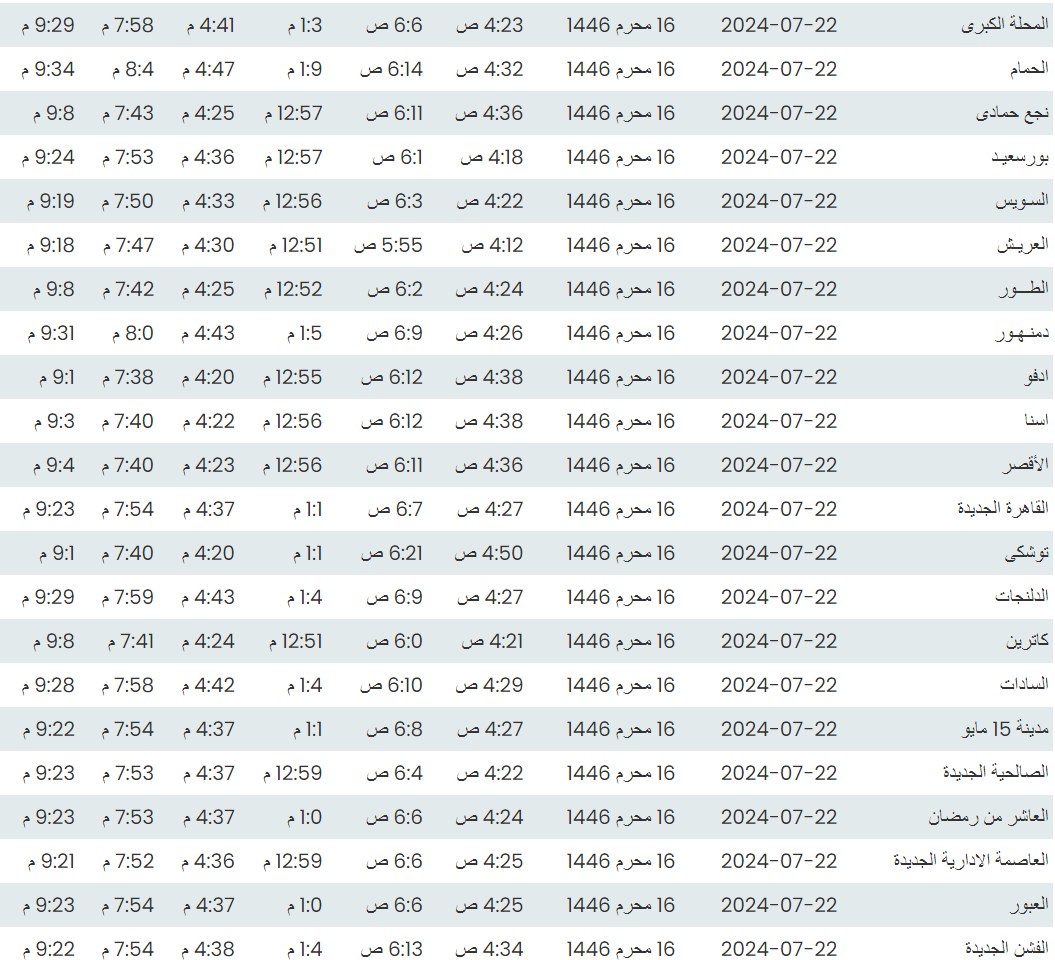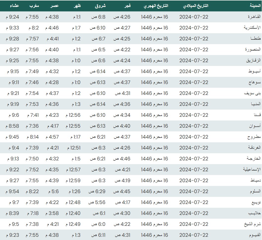 وفيما يلي مواقيت الصلاة، لعدد من مدن ومحافظات الجمهورية من واقع بيانات الهيئة العامة للمساحة