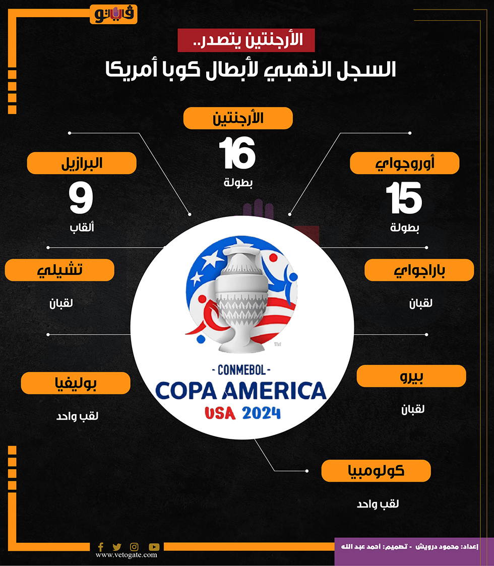 الأرجنتين يتصدر.. السجل الذهبي لأبطال كوبا أمريكا (انفوجراف) الإثنين 15/يوليو/2024 - 03:30 م 7/15/2024 3:30:06 PM الأرجنتين محمود درويش شارك طباعة 18 حجم الخط شارك طباعة كوبا امريكا الأرجنتين اوروجواي البرازيل
