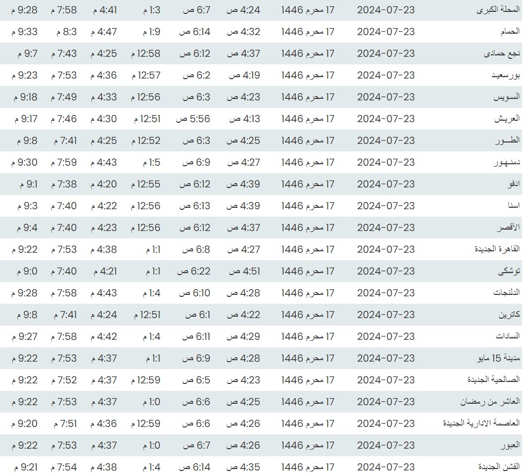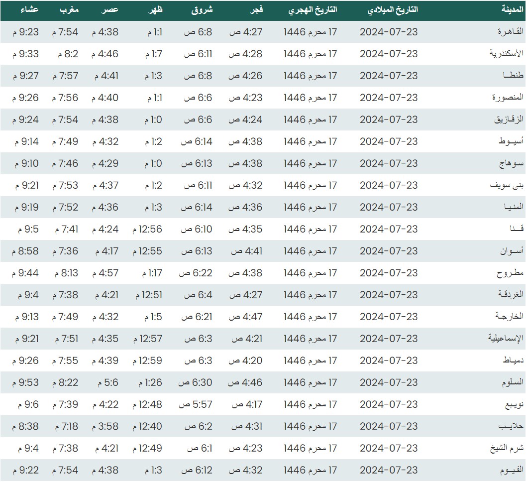 مواقيت الصلاة اليوم وفقًا للتوقيت المحلي لمدينتي القاهرة والإسكندرية وكذلك،مواقيت الصلاة، لعدد من مدن ومحافظات الجمهورية من واقع بيانات الهيئة العامة للمساحة