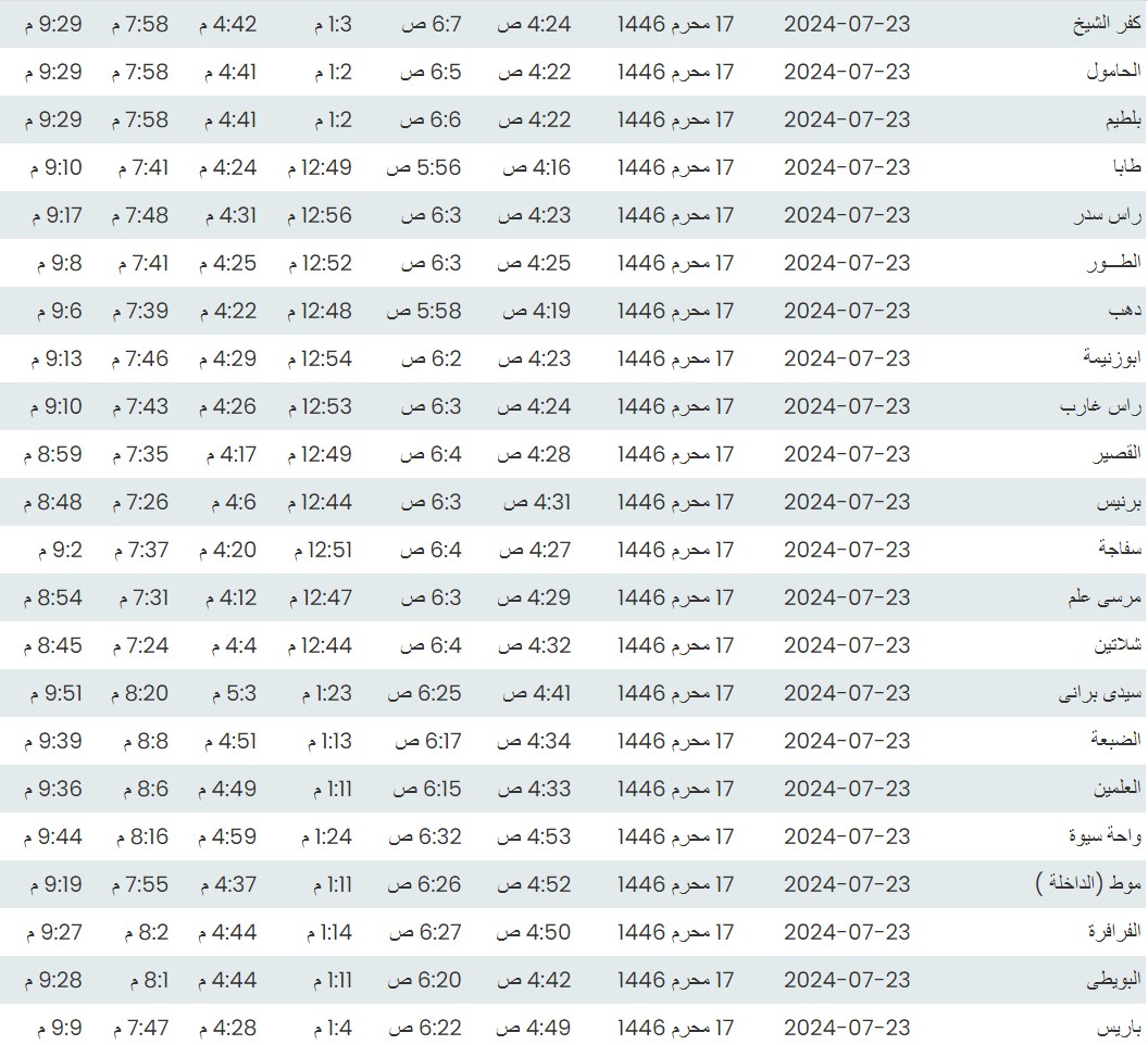 وفيما يلي مواقيت الصلاة، لعدد من مدن ومحافظات الجمهورية من واقع بيانات الهيئة العامة للمساحة