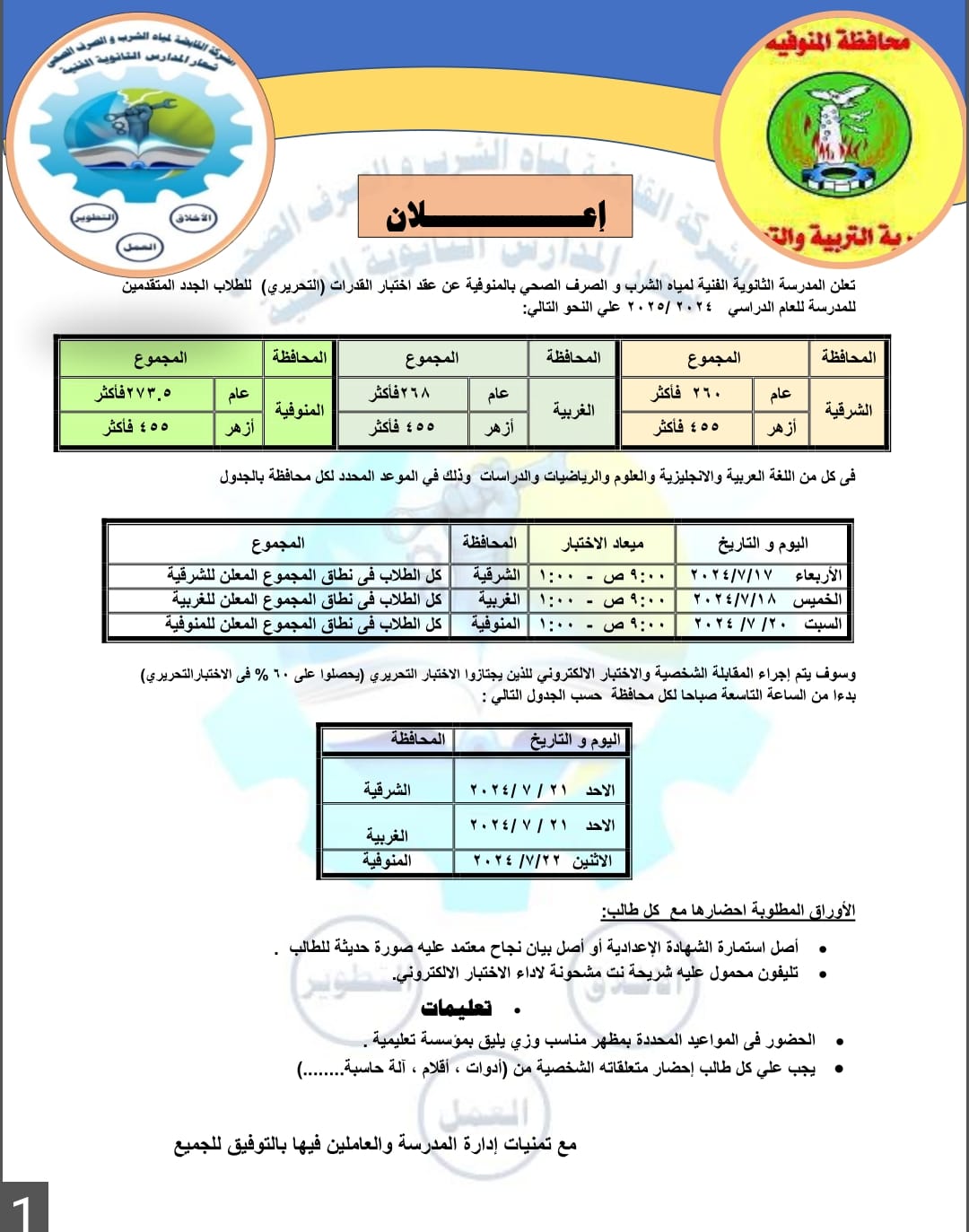 أعلنت المدرسة الثانوية الفنية لمياه الشرب والصرف الصحى بمحافظة المنوفية، عن تحديد مجموع 273.5 للإعدادى العام، و455 للإعدادى الأزهر للقبول بالمدرسة.