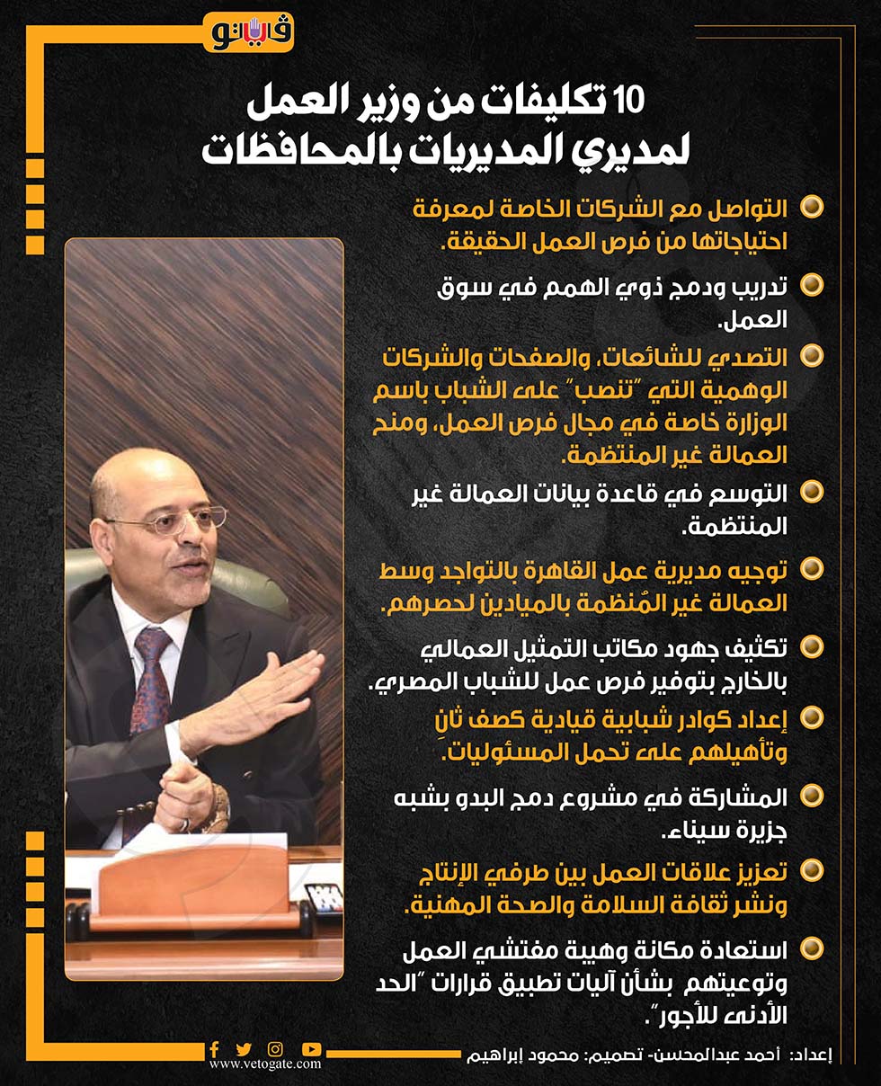 10 تكليفات من وزير العمل لمديري المديريات بالمحافظات (إنفوجراف) الإثنين 15/يوليو/2024 - 11:04 م 7/15/2024 11:04:02 PM محمد جبران وزير العمل، فيتو أحمد عبدالمحسن شارك طباعة 18 حجم الخط شارك طباعة السلامة والصحة المهنية بيانات العمالة غير المنتظمة توفير فرص عمل للشباب دمج ذوي الهمم في سوق العمل منح العمالة غير المنتظمة مكاتب التمثيل العمالي