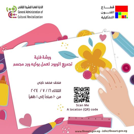 وينظم القطاع كذلك ورشة “ تجميع الورود لعمل بوكيه ورد مجسم ” بمتحف محمد ناجي يستخدم في التزيين والديكو وذللك من الساعة الـ 10 صباحًا وحتي الـ 1 ظهرًا.