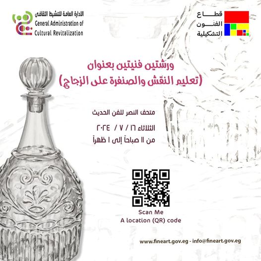 ويقيم الفنون التشكيلية ورشة “ تعليم النقش والصنفرة على الزجاج ” بمتحف النصر للفن الحديث ببورسعيد ورشتين فنيتين من الساعة الـ 11 صباحًا وحتي الـ 1 ظهرًا.