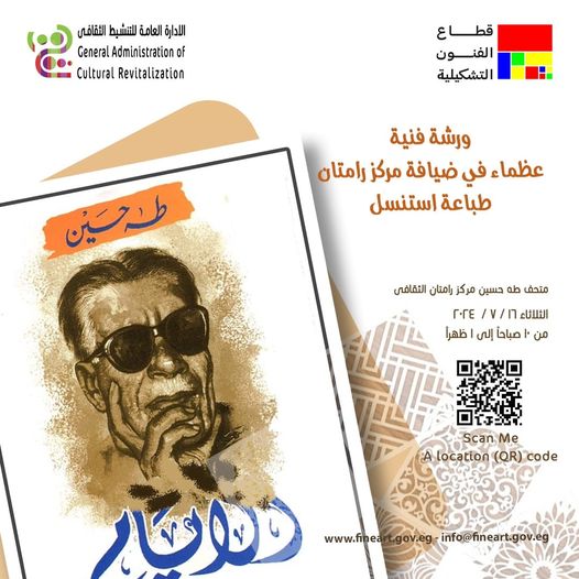 ويقيم قطاع الفنون التشكيلية بمركز رامتان الثقافي بمتحف طه حسين ورشة فنية بعنوان "عظماء في ضيافة مركز رامتان" طباعة استنسل من الساعة الـ 10 صباحًا وإلى الـ 1 ظهرًا.