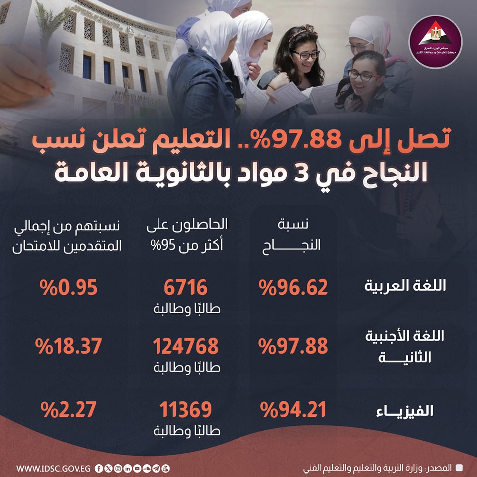 تصل لـ 97.88%.. التعليم تعلن نسب النجاح في 3 مواد بالثانوية العامة (إنفوجراف)