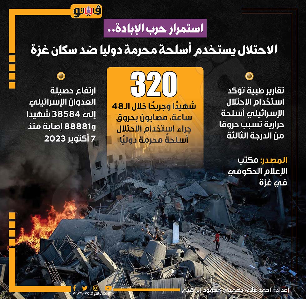 استمرار حرب الإبادة.. الاحتلال يستخدم أسلحة محرمة دوليا ضد سكان غزة (انفوجراف) الخميس 18/يوليو/2024 - 12:37 م 7/18/2024 12:37:55 PM غزة، فيتو احمد علاء شارك طباعة 18 حجم الخط شارك طباعة غزة حماس العدوان على غزة جيش الاحتلال الإعلام الحكومي في غزة الاحتلال الإسرائيلي أسلحة محرمة دوليا الاحتلال