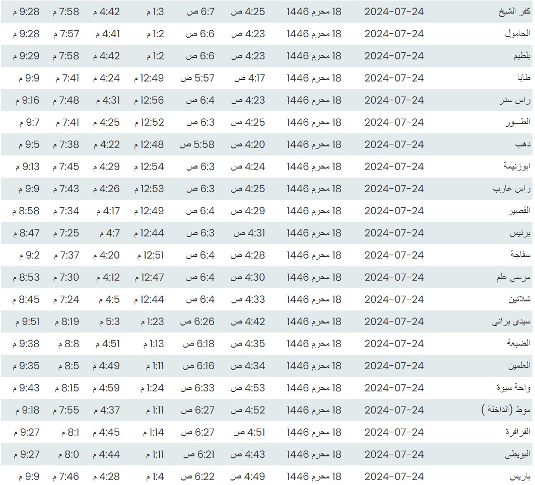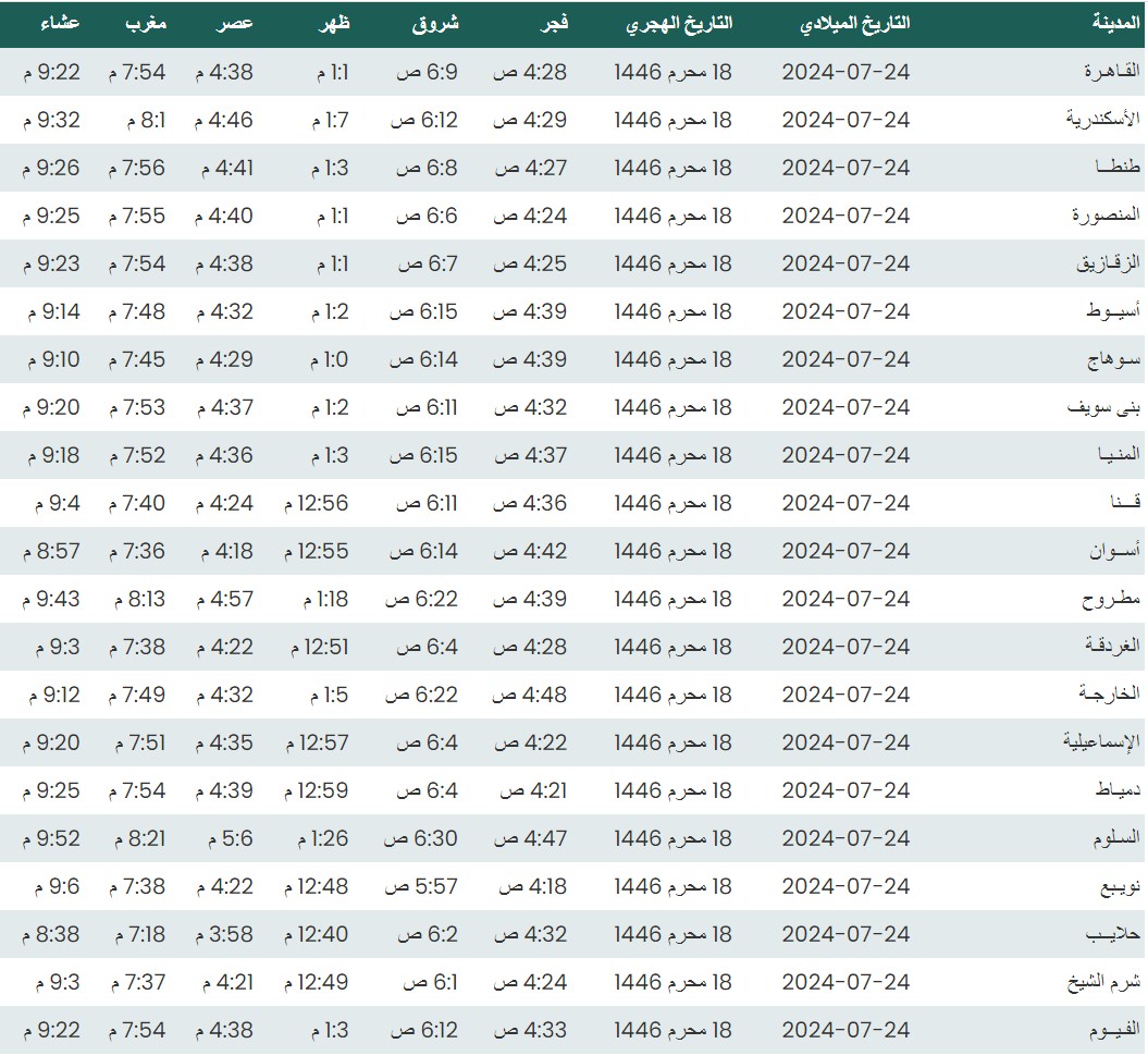 وفيما يلي مواقيت الصلاة، لعدد من مدن ومحافظات الجمهورية من واقع بيانات الهيئة العامة للمساحة