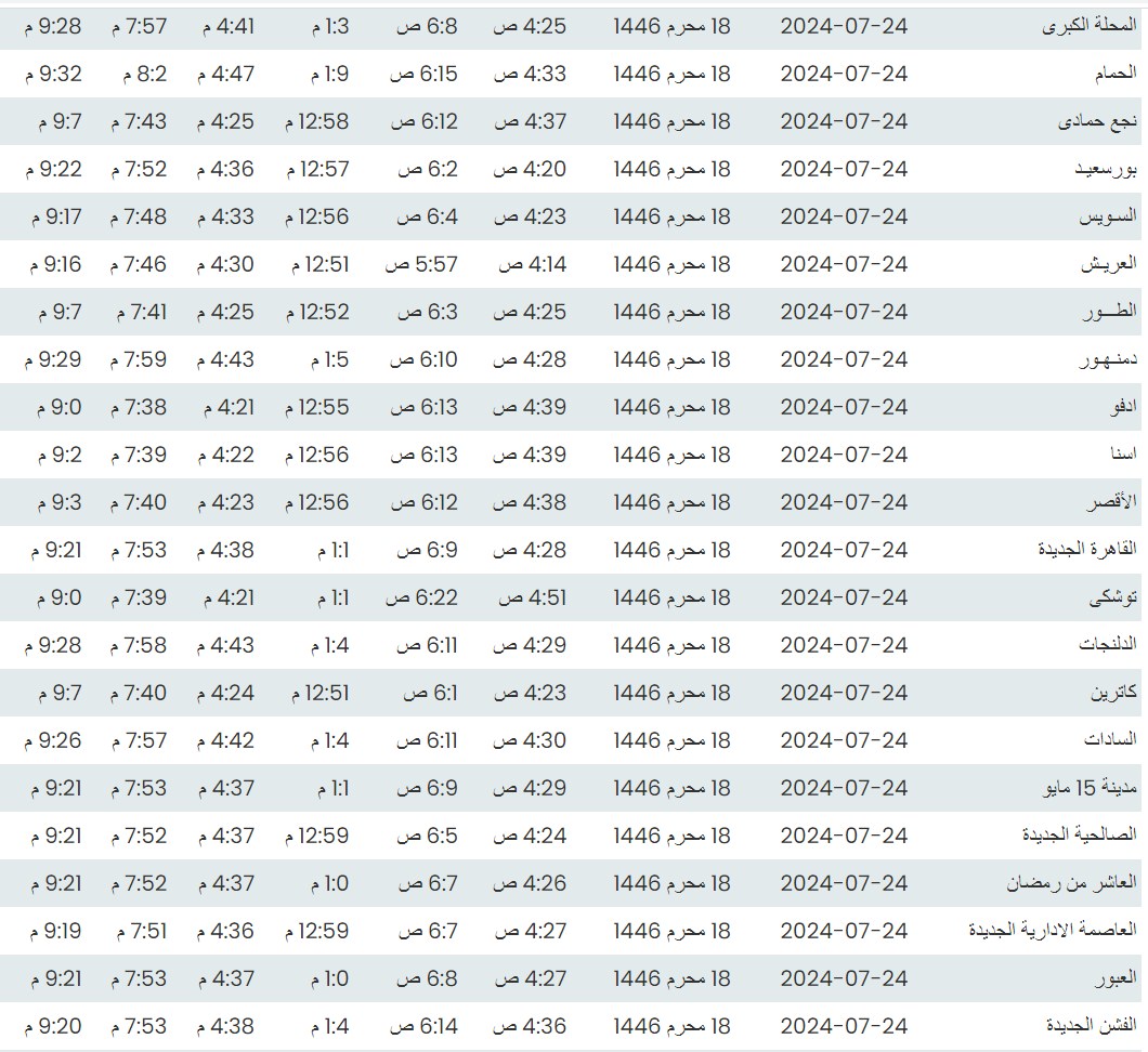 مواقيت الصلاة اليوم وفقًا للتوقيت المحلي لمدينتي القاهرة والإسكندرية وكذلك،مواقيت الصلاة، لعدد من مدن ومحافظات الجمهورية من واقع بيانات الهيئة العامة للمساحة